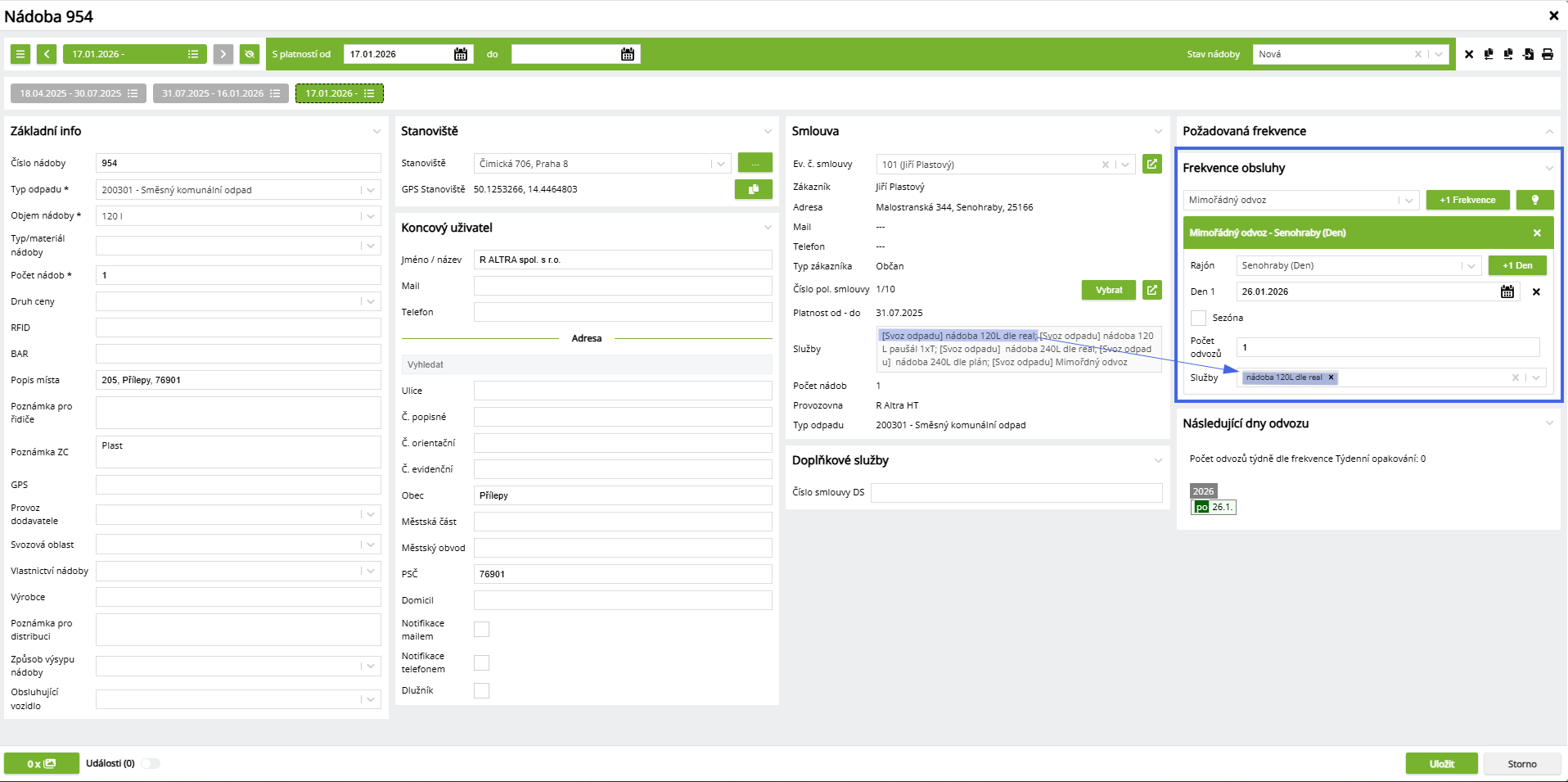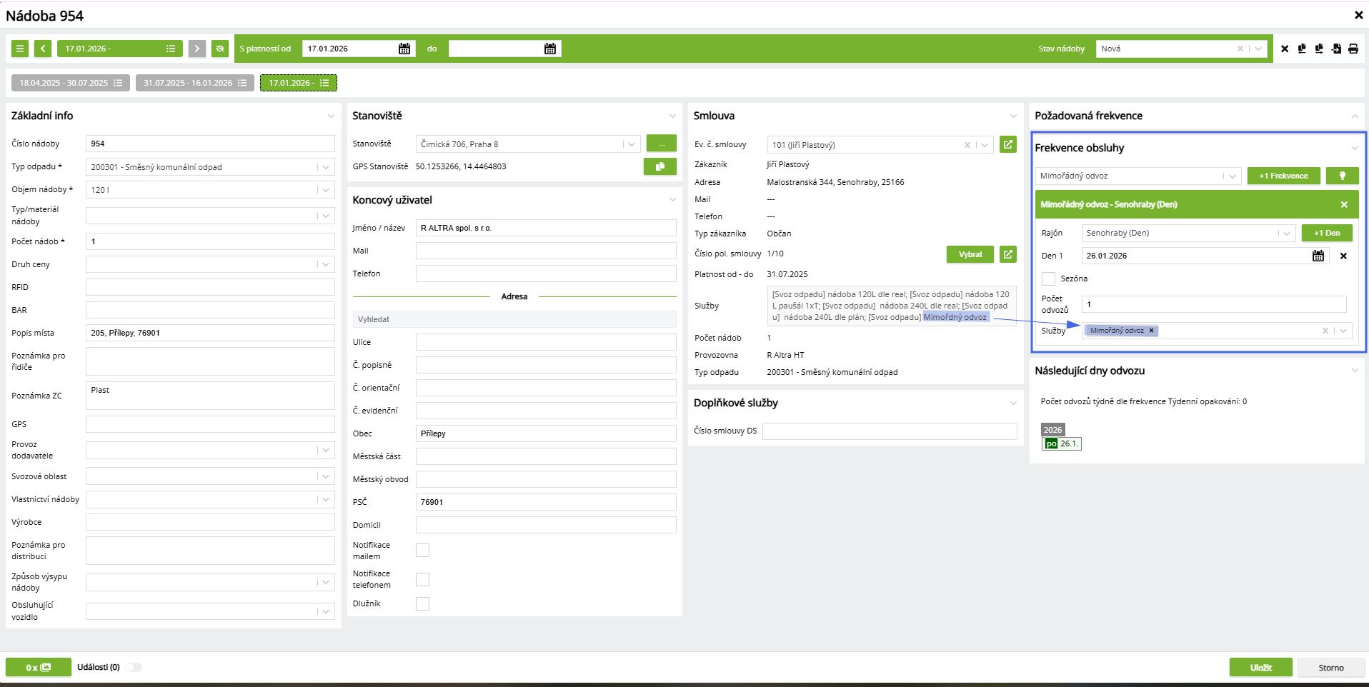 Pokud se mimořádný odvoz na nádobě fakturuje nad rámec standardních svozů, je nutné mít speciální službu na položce smlouvy a nastavit ji k dané frekvenci.
