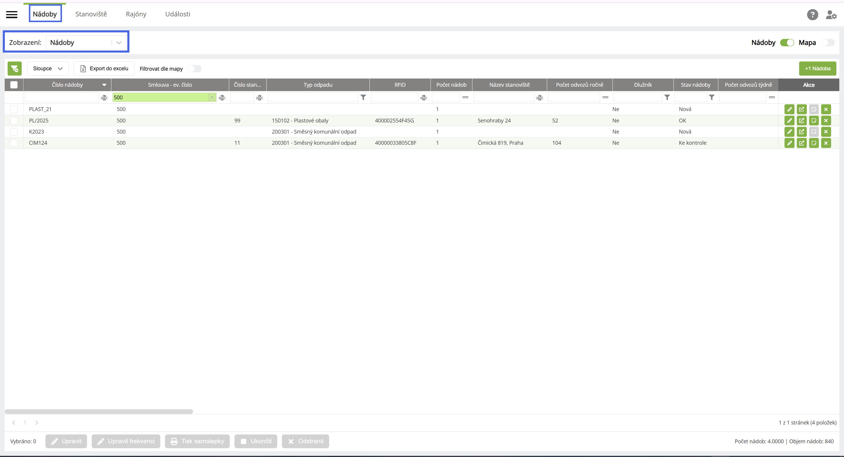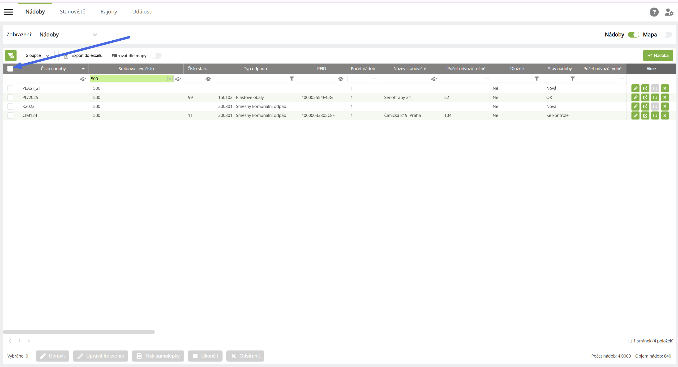 1. Na záložce nádoby si vyfiltrujeme potřebné nádoby, u kterých potřebujeme provést změnu smlouvy.