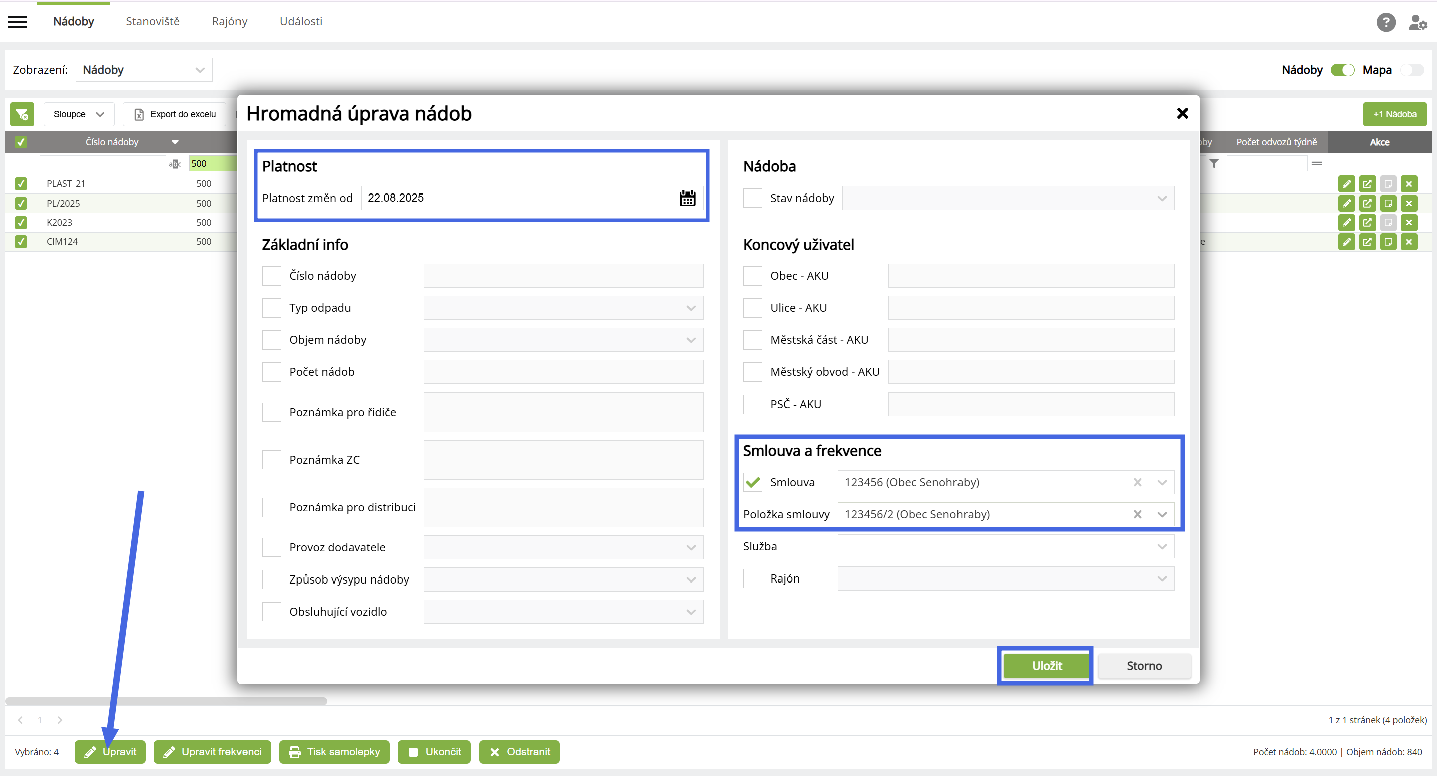 Hromadná změna položek smluv na nádobách