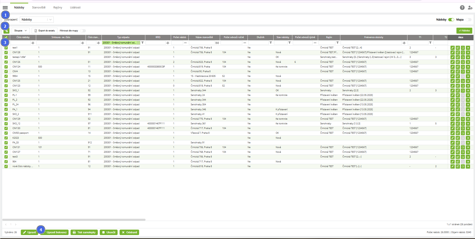 1. Přepne na zobrazení přehledu nádob na "Frekvence".