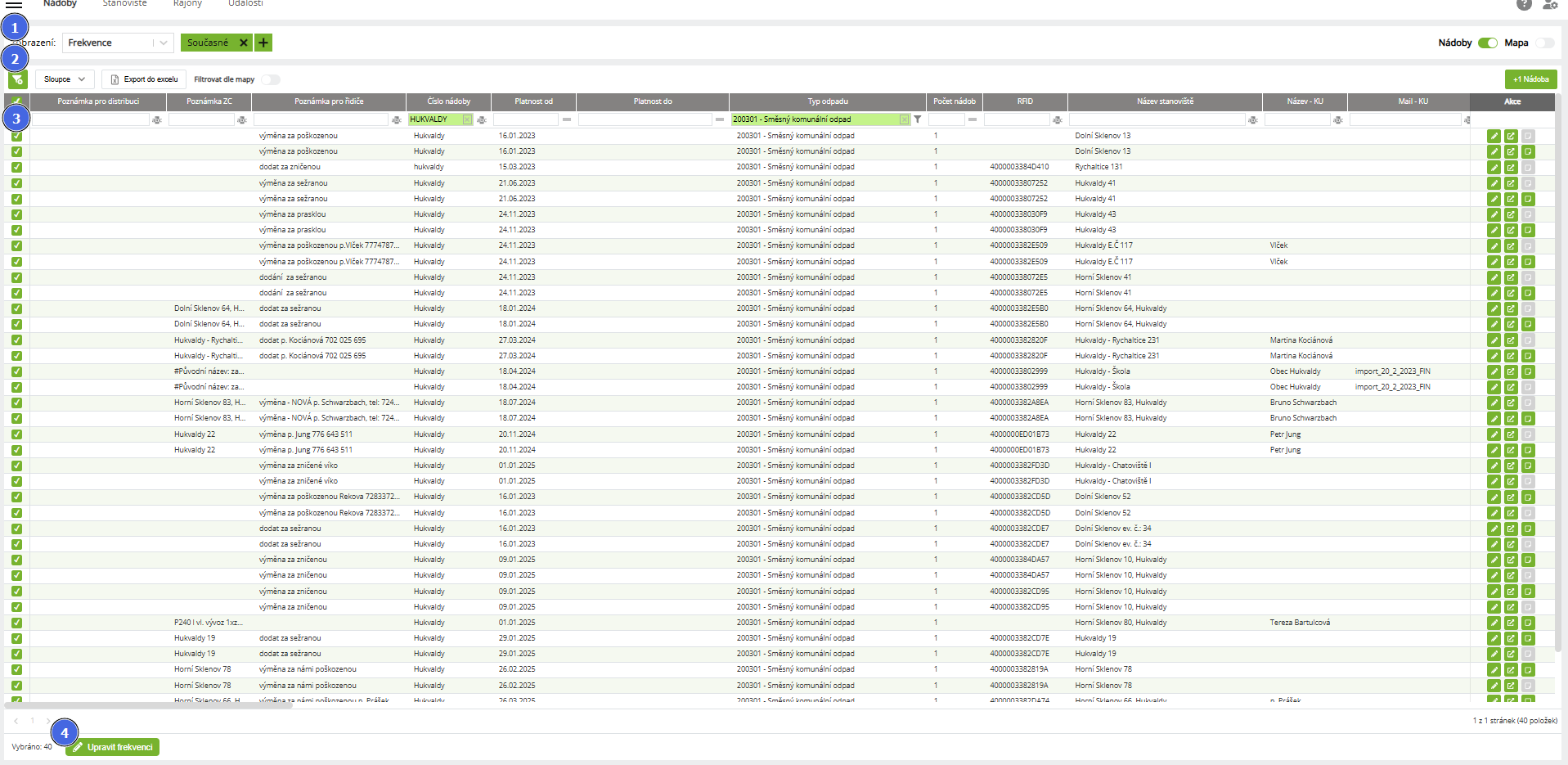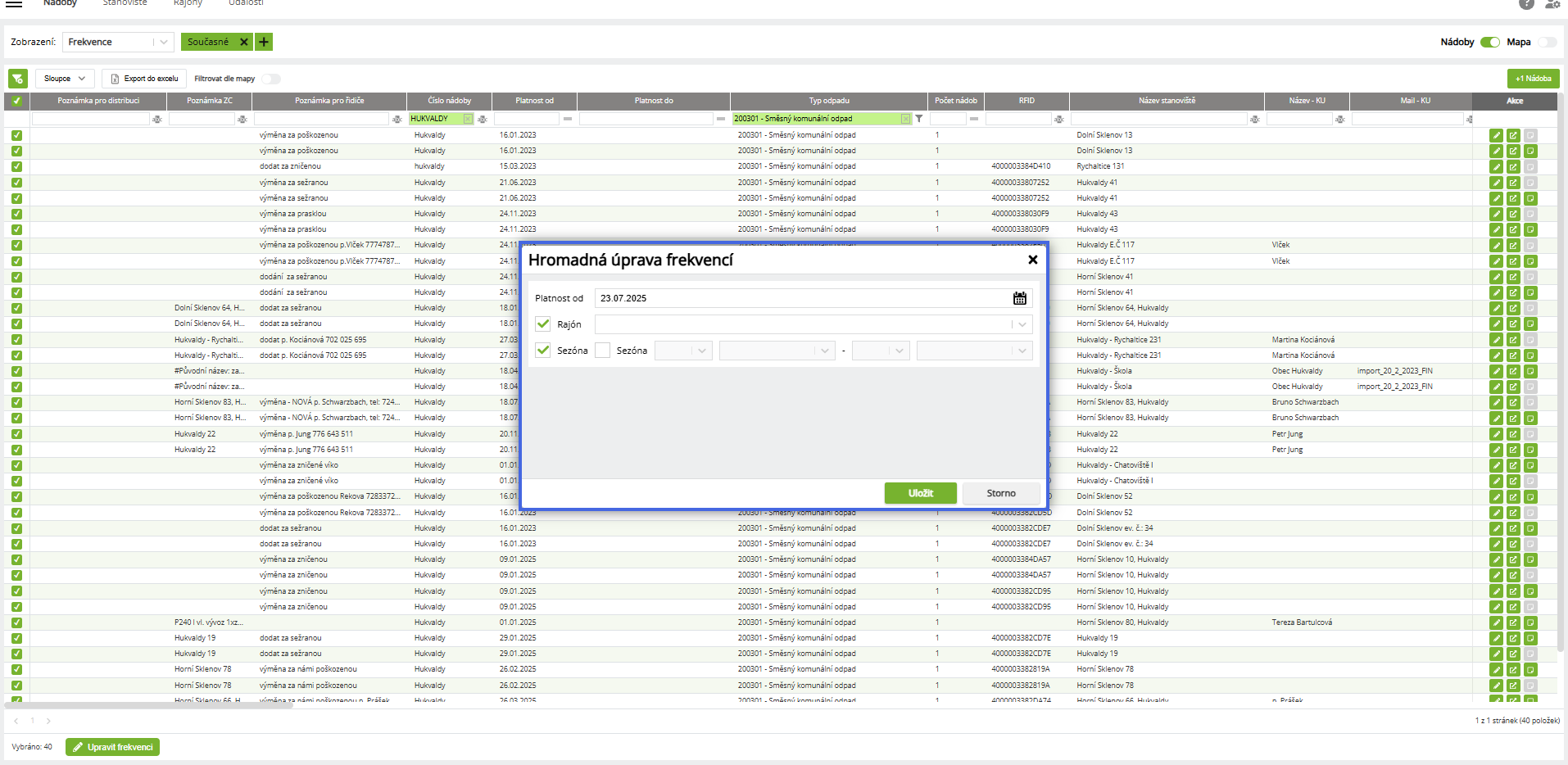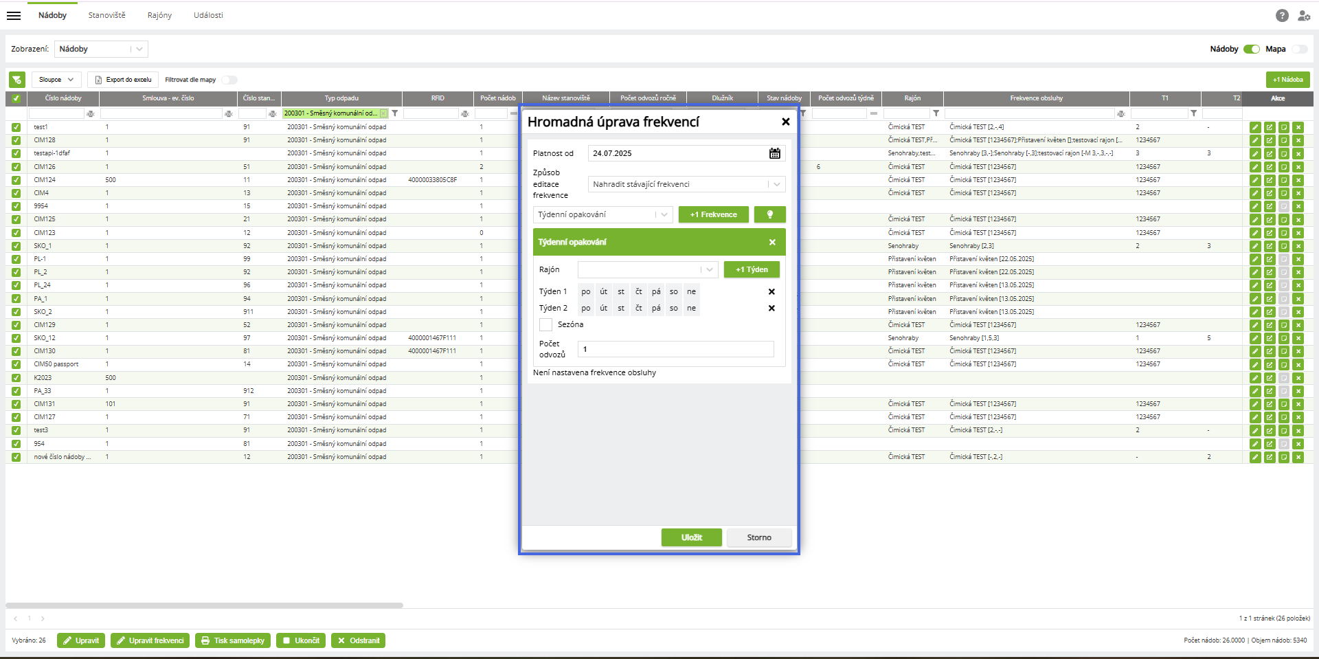 Hromadný přesun nádob na jiné svozy (změna frekvencí)