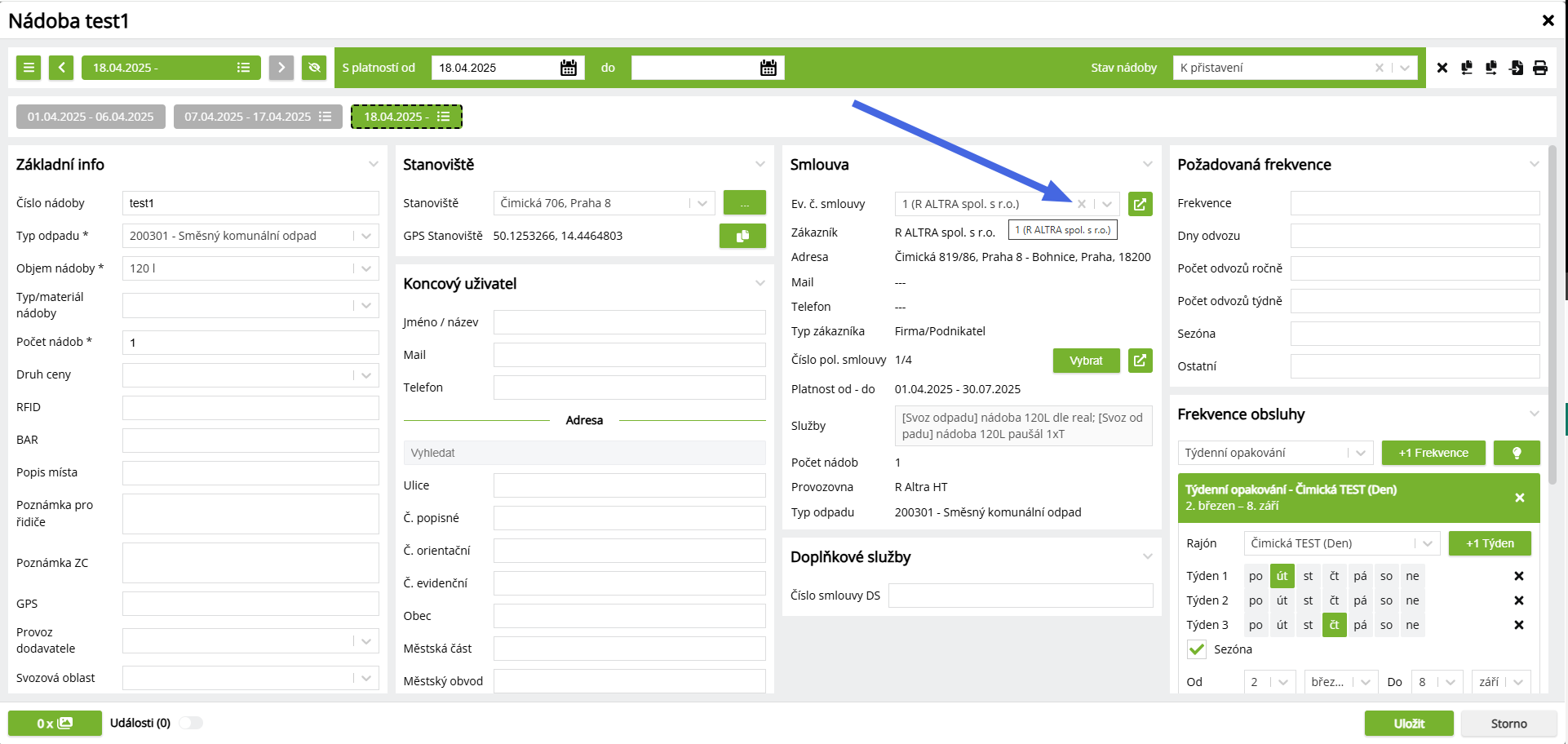 Nádobu připojenou k cyklické položce smlouvy lze odebrat pomocí prokliku ve sloupci Akce do modulu nádob. V modulu nádoby je pak třeba odebrat vazbu nádoby na smlouvu kliknutím na křížek u Ev. č. smlouvy. Tímto krokem se odebere nádoba od smlouvy a změna se projeví i v modulu obchod.