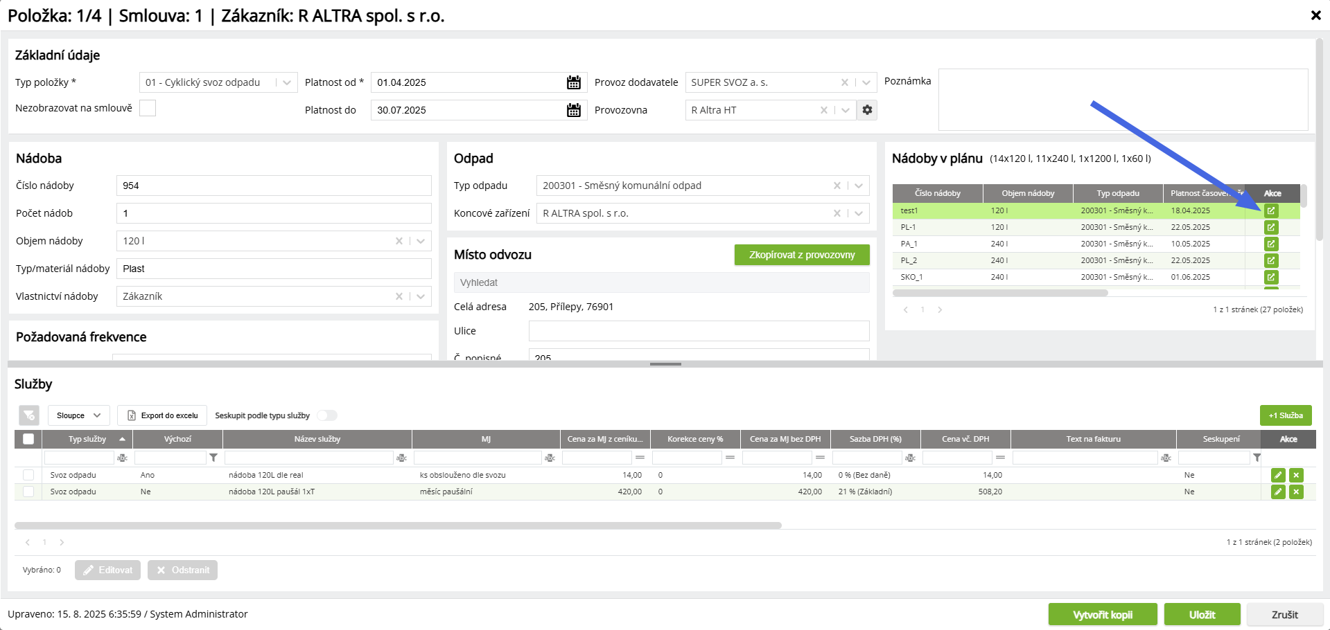 Doporučujeme nádobu následně připojit k jiné smlouvě nebo pokud již není aktuální ji odstranit resp. jí ukončit platnost.