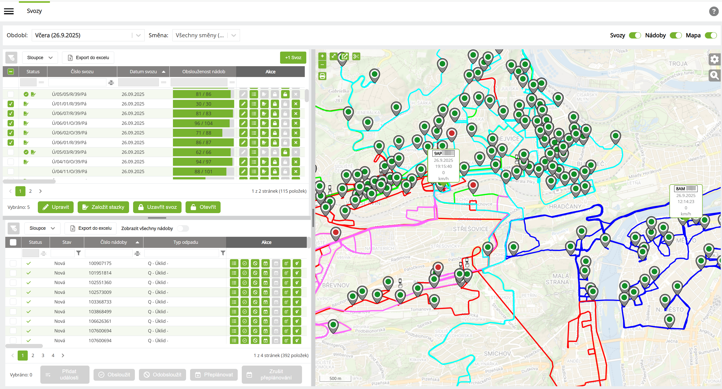 Ano, v mapě je možné zapnout sledování až 5 svozů najednou. Trajektorie vozidel na jednotlivých svozech jsou pro lepší přehlednost odlišené barevně. U každé trajektorie se také zobrazuje bublina s RZ vozidla.