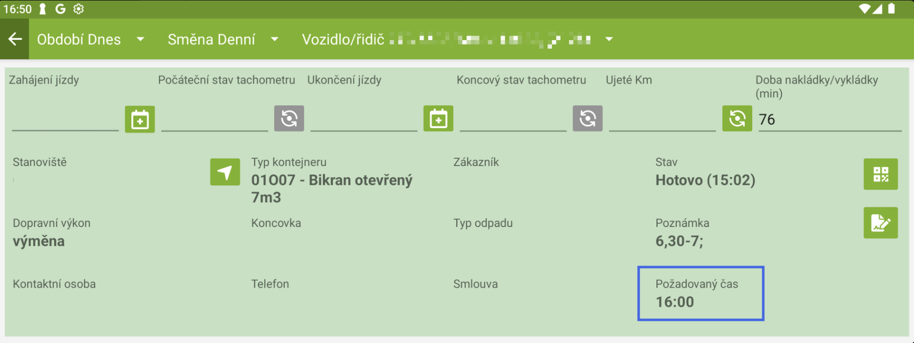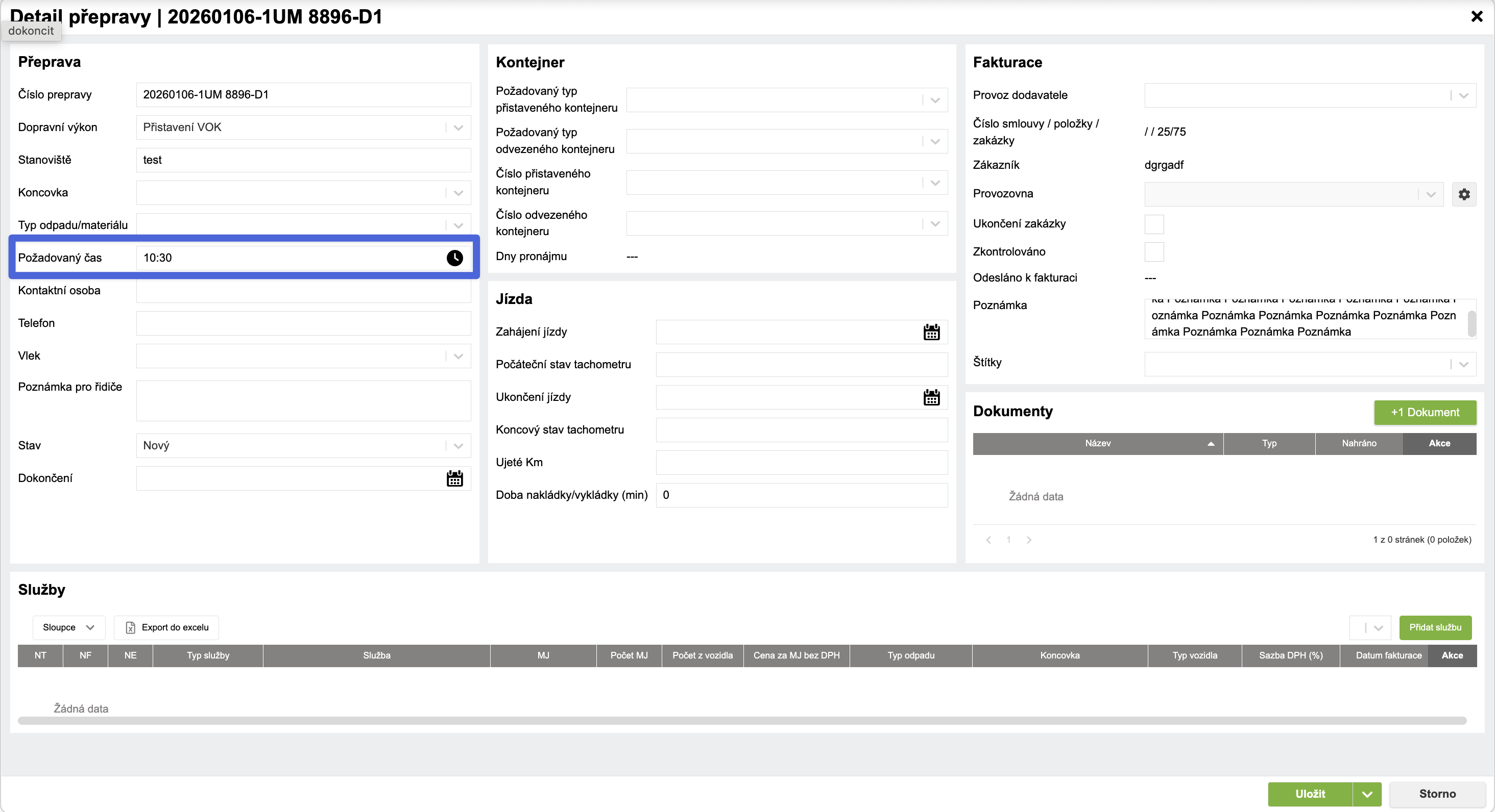 - při nastavení požadovaného času se hodnota zobrazí v přehledu přeprav i v detailu přepravy,