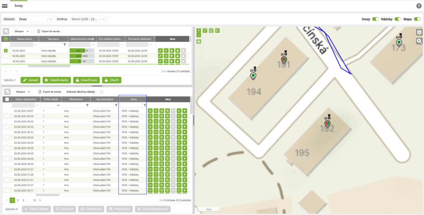 - Ve sloupečku Zdroj je označena: RFID + Nádoby