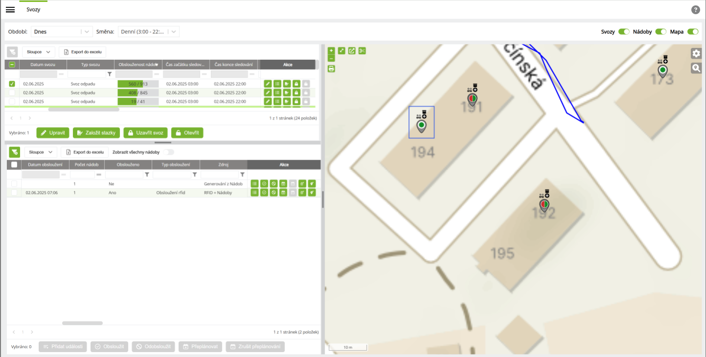 - Pokud načtené RFID není v databázi nalezeno, do svozu se přidá fiktivní nádoba a fiktivní stanoviště s minimálními údaji.