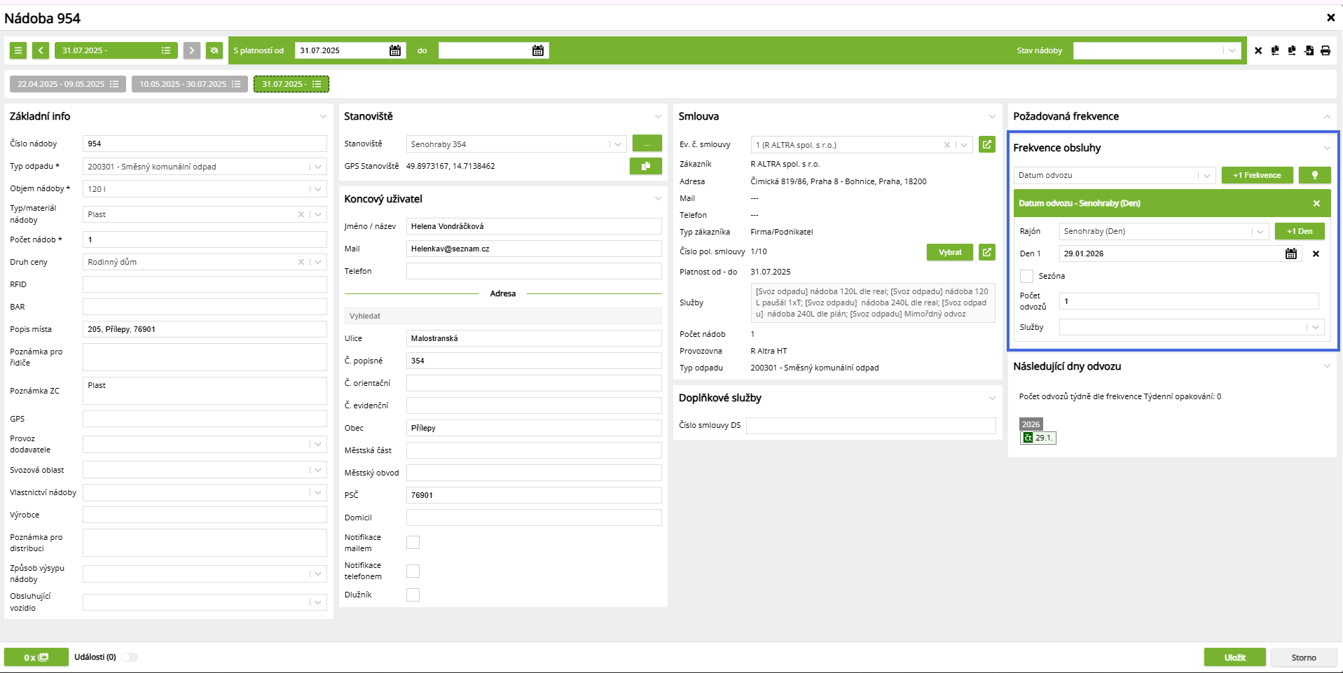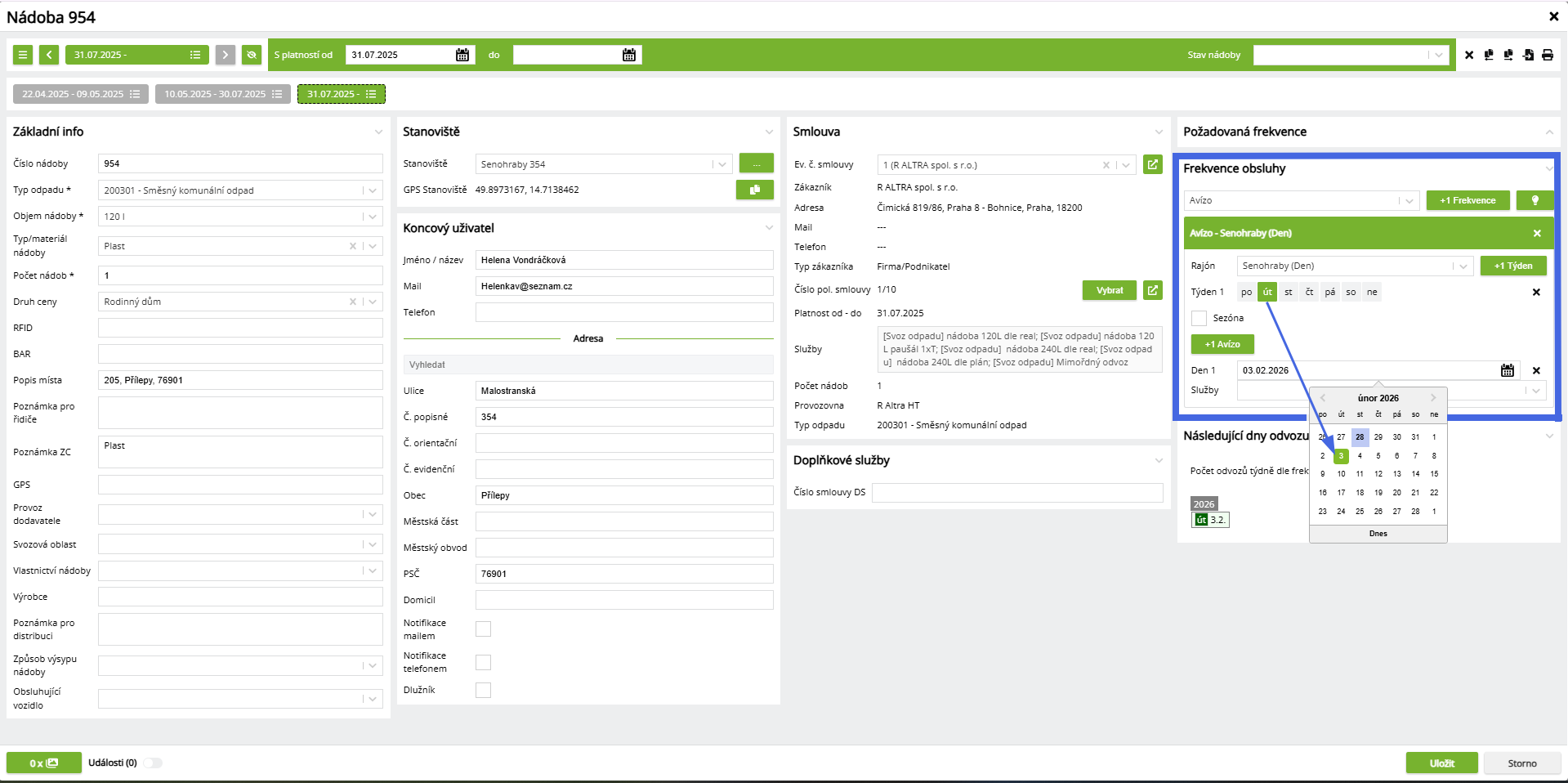 Na danou frekvenci lze nastavit standardní službu pro odvoz nebo speciální službu pro odvoz na avízo.