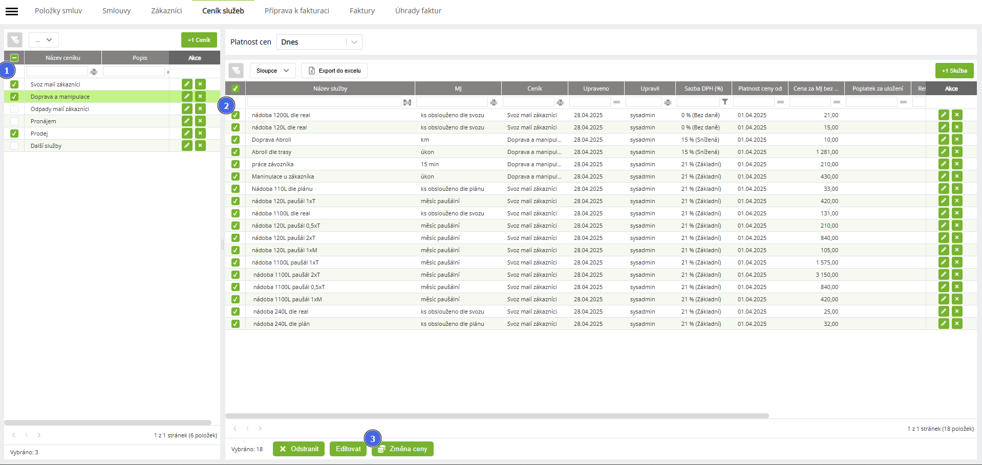 | 1 | Výběr více ceníků | Výběrem více ceníků se v pravé části zobrazí jednotlivé ceníkové položky napříč všemi zvolenými ceníky. |