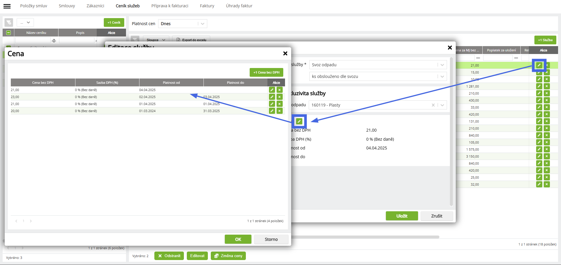 Při nutnosti změn ceníků a cen na stávajících smlouvách doporučujeme tento uživatelský postup. Spočítává v úpravě ceny v ceníku a následně aplikaci změny na smlouvě.