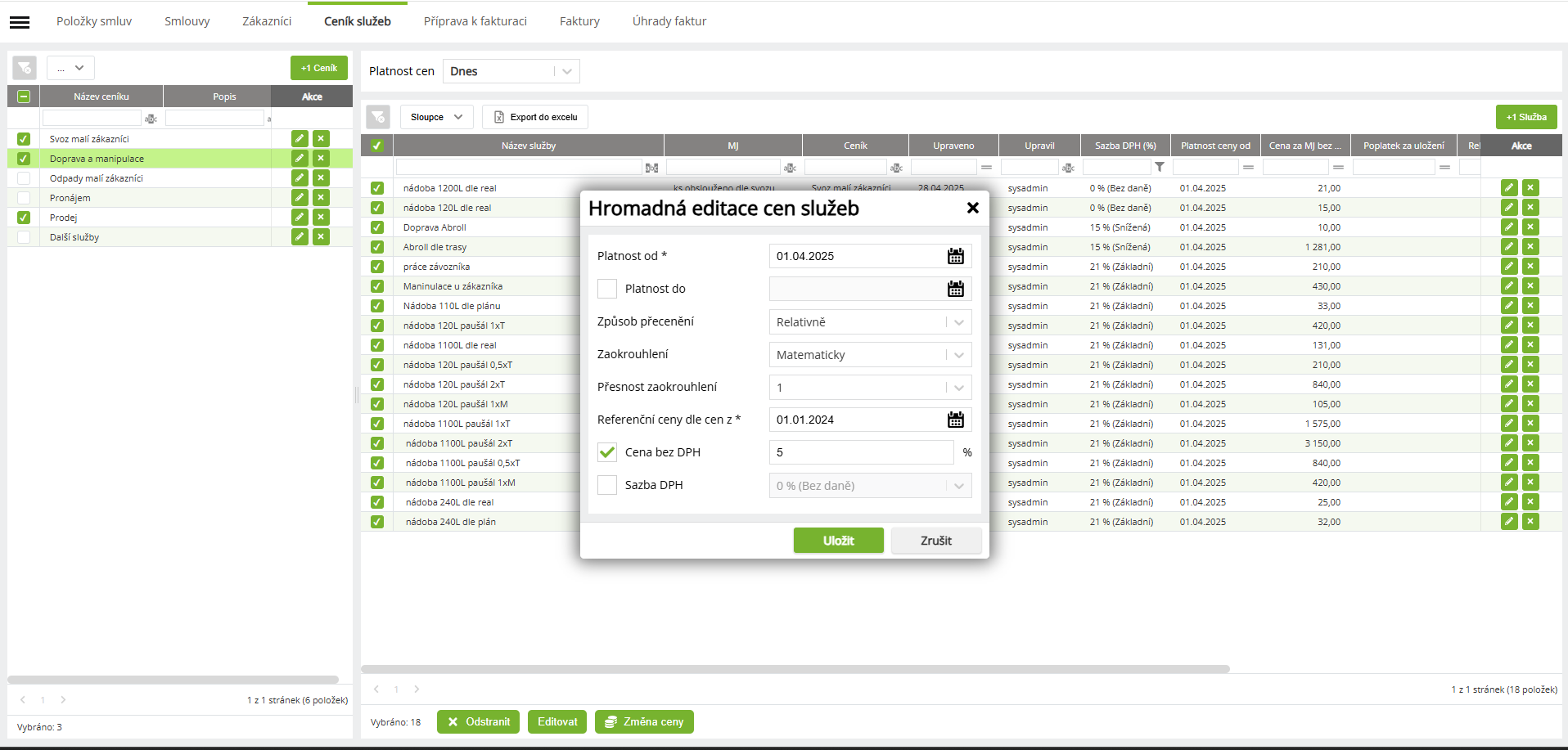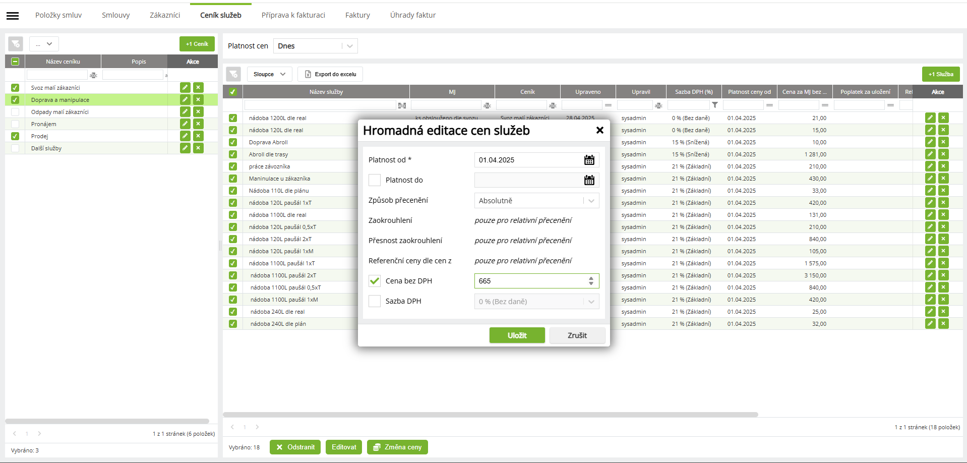 POZOR Změny cen je možné provést u položek se stejnou strukturou ceny. Tedy není možné hromadně upravit Typ služby Doprava a Odpady, protože cena Odpadů se skládá z několika částí (Cena, Poplatek za uložení, Rekultivační rezerva).