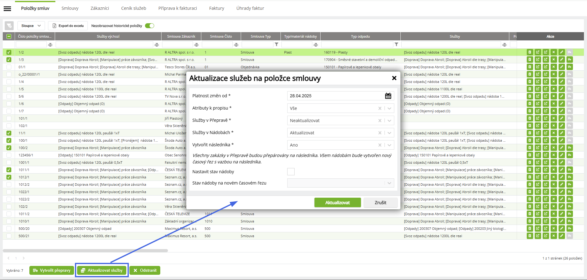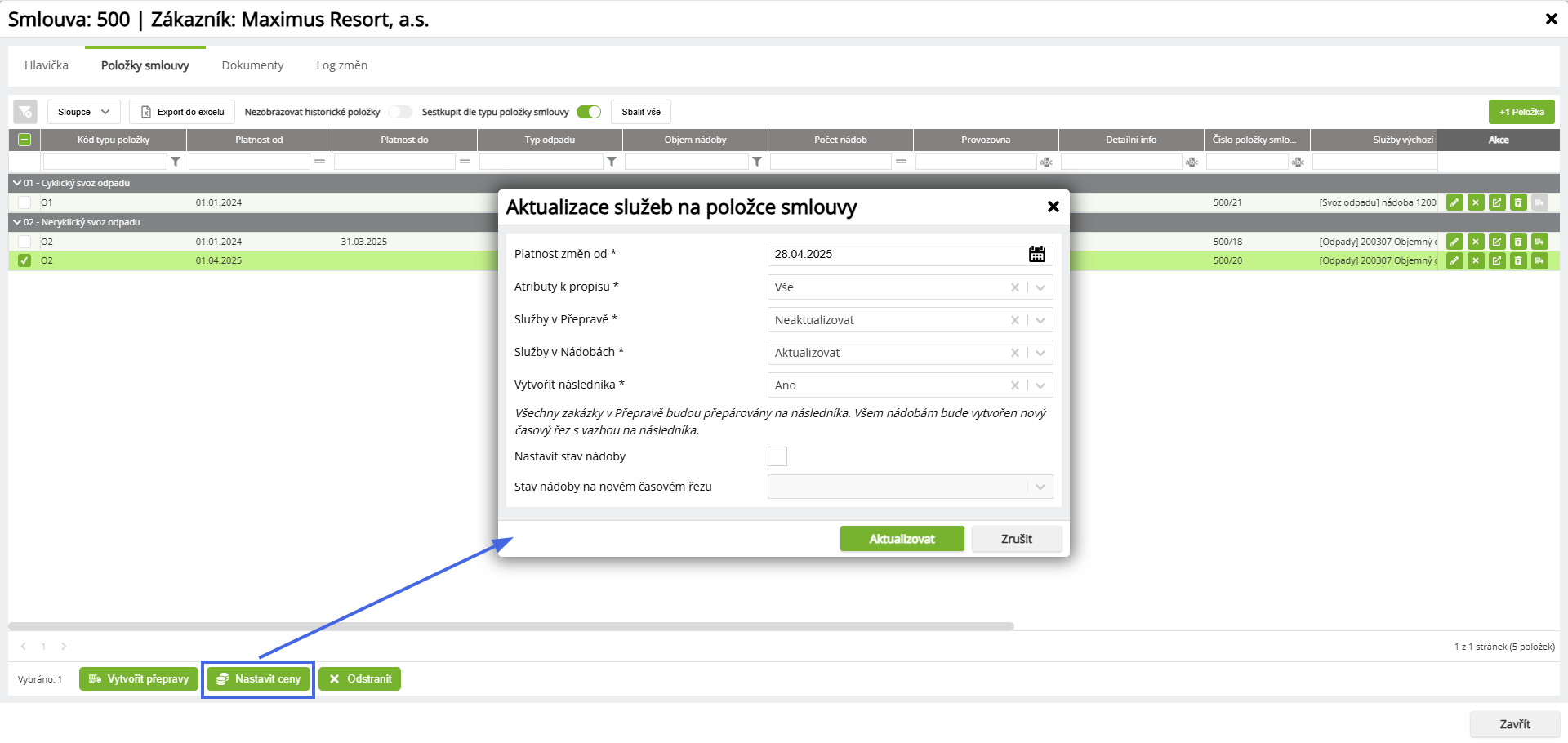 - Služby v Nádobách - Aktualizace cen služeb přiřazených k nádobám.