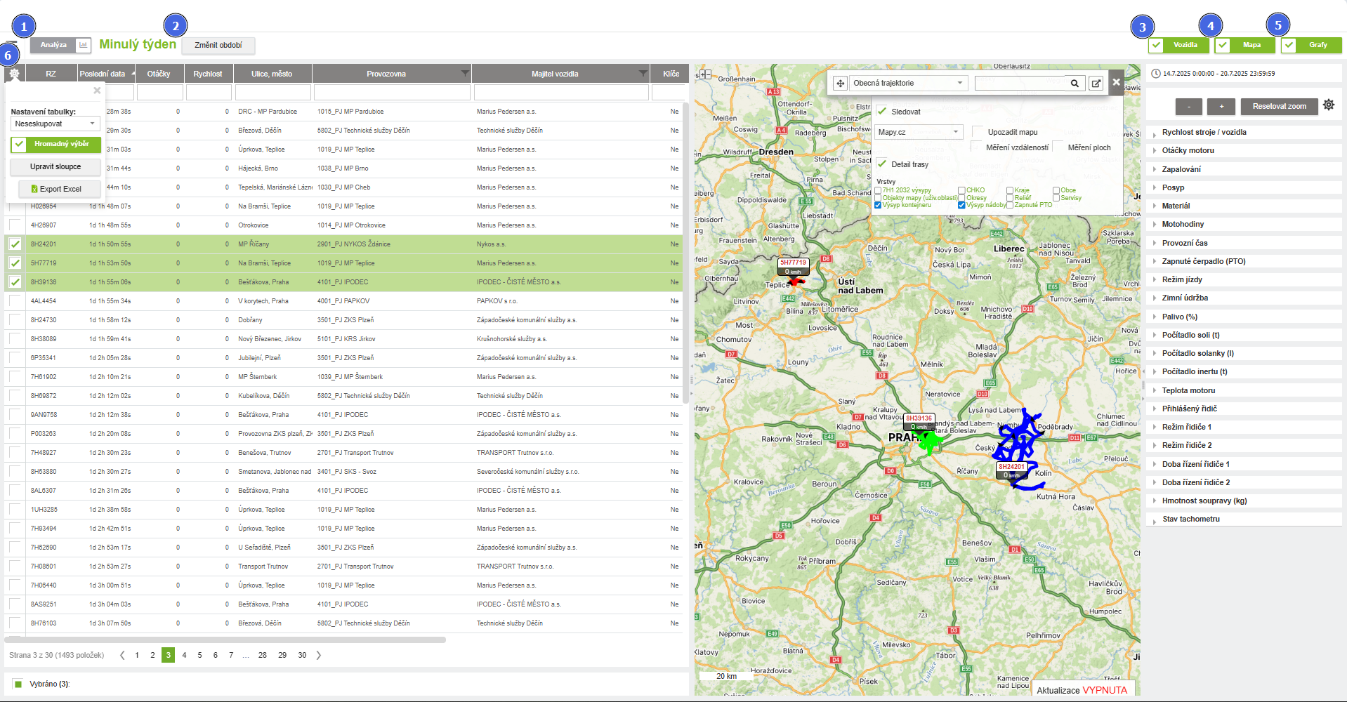 • Konfigurace zobrazení: Uživatel si může přizpůsobit výběr vozidel, viditelnost grafů i konfiguraci sloupců v seznamu.