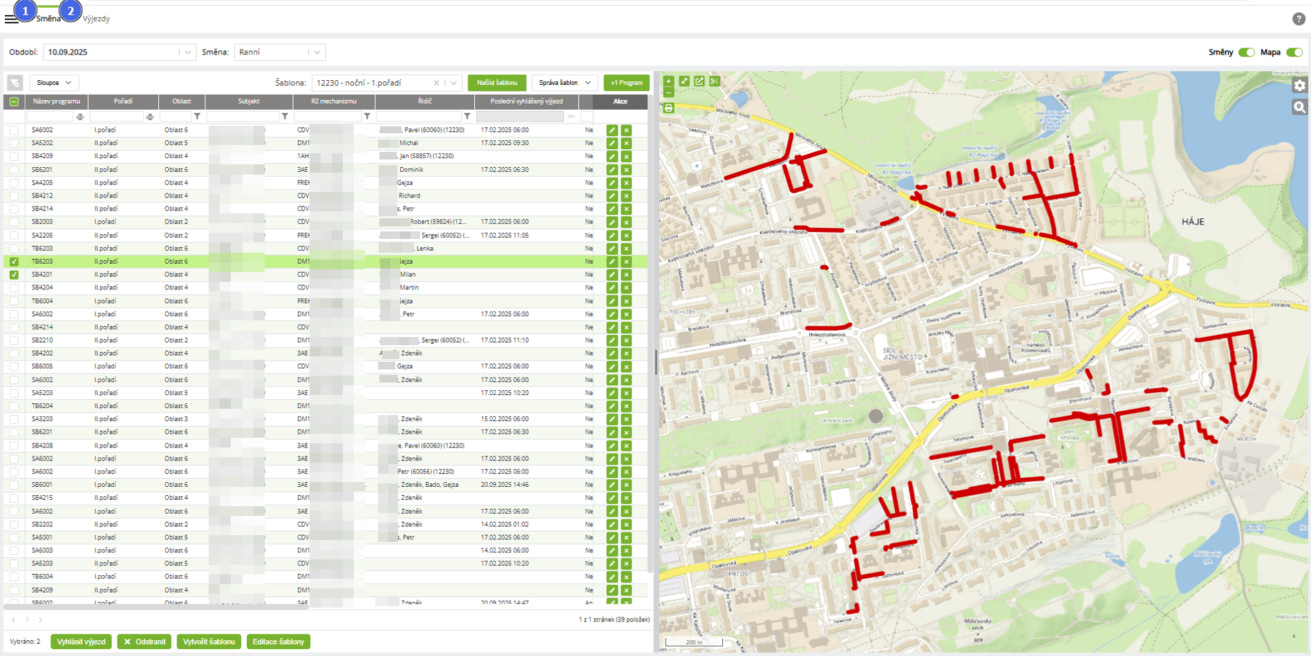 - Výjezdy: zde probíhají samotné výjezdy a jejich vyhodnocení