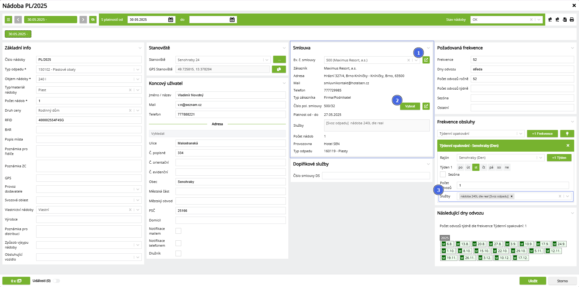 | 2 | Přiřazení položky smlouvy | Umožňuje vybrat konkrétní položku smlouvy, která se týká dané nádoby a je součástí smlouvy, která byla navolena výše. |