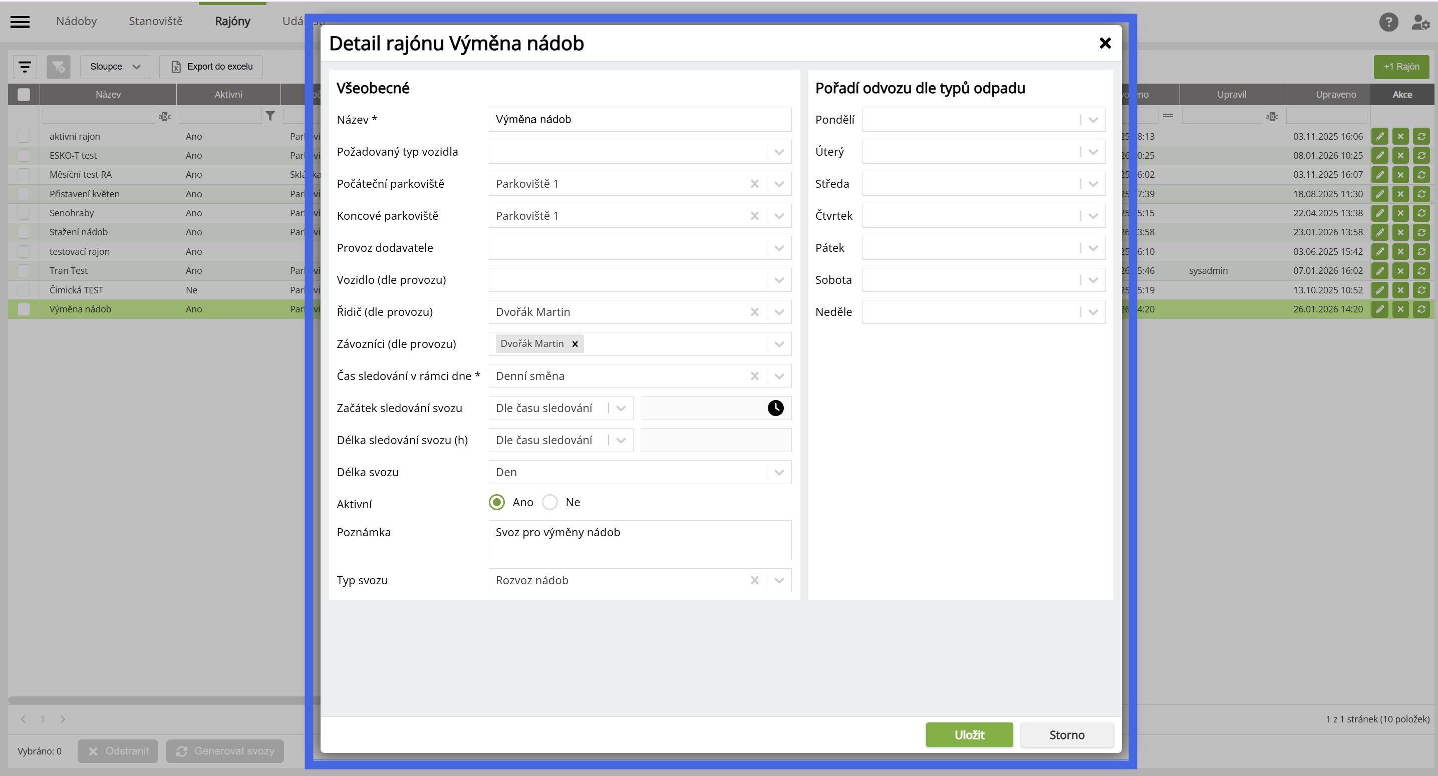 Vytvoření rajonu (svozu) pro výměnu nádob