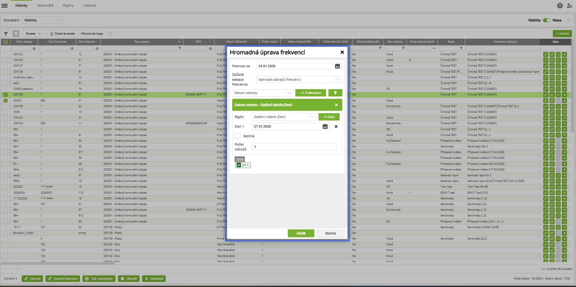 - Kliknutím na tlačítko "Uložit" se nám provede úprava frekvence na nádobách.