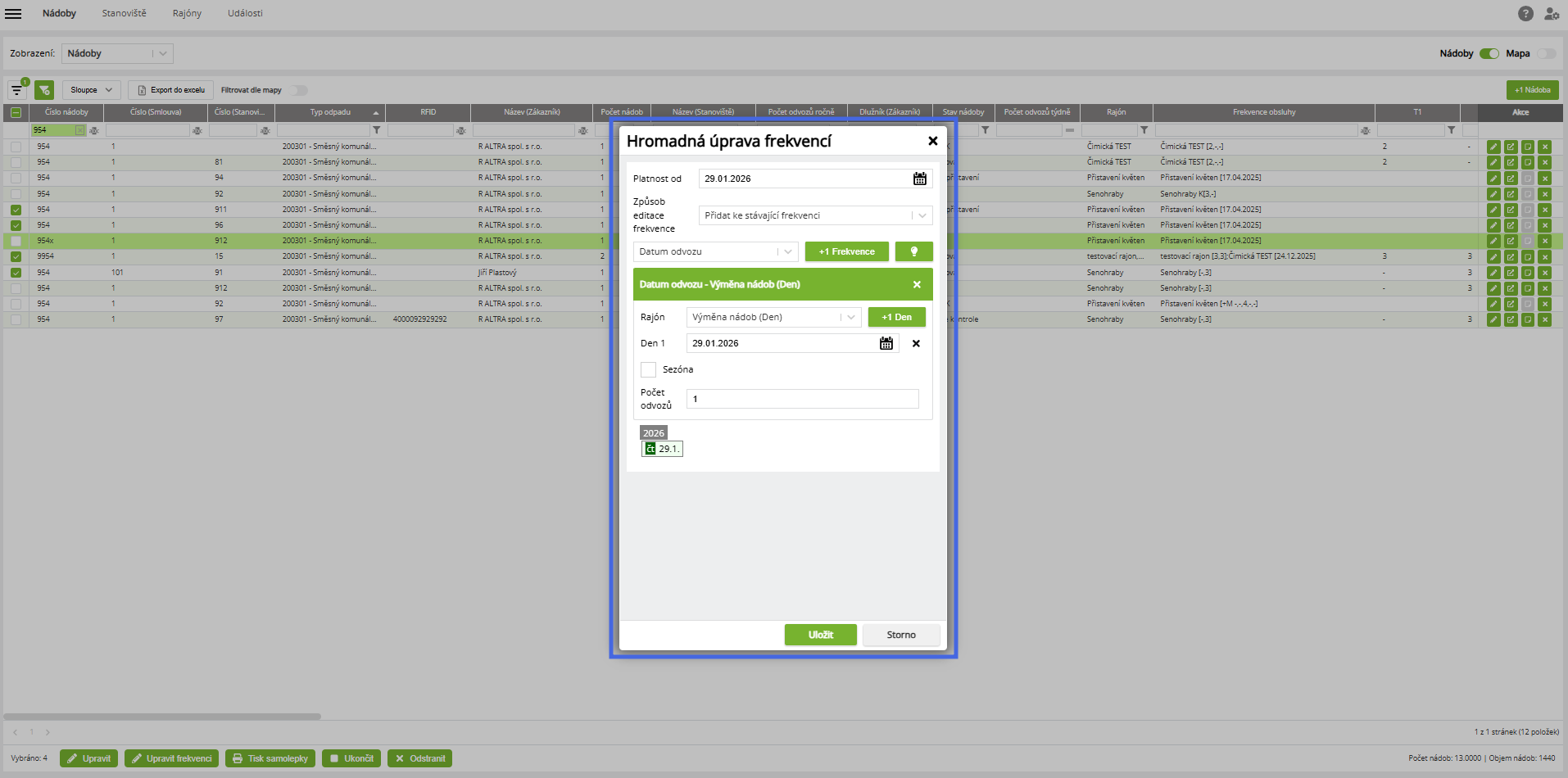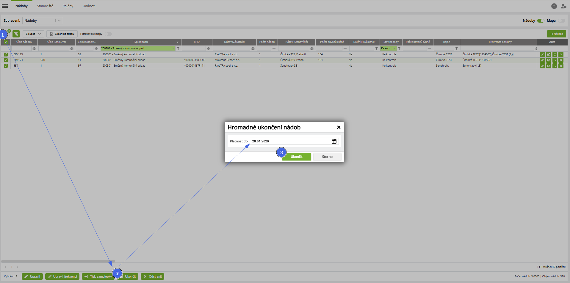- Nádoby určené k výměně je nutné v přehledu nádob vyfiltrovat.