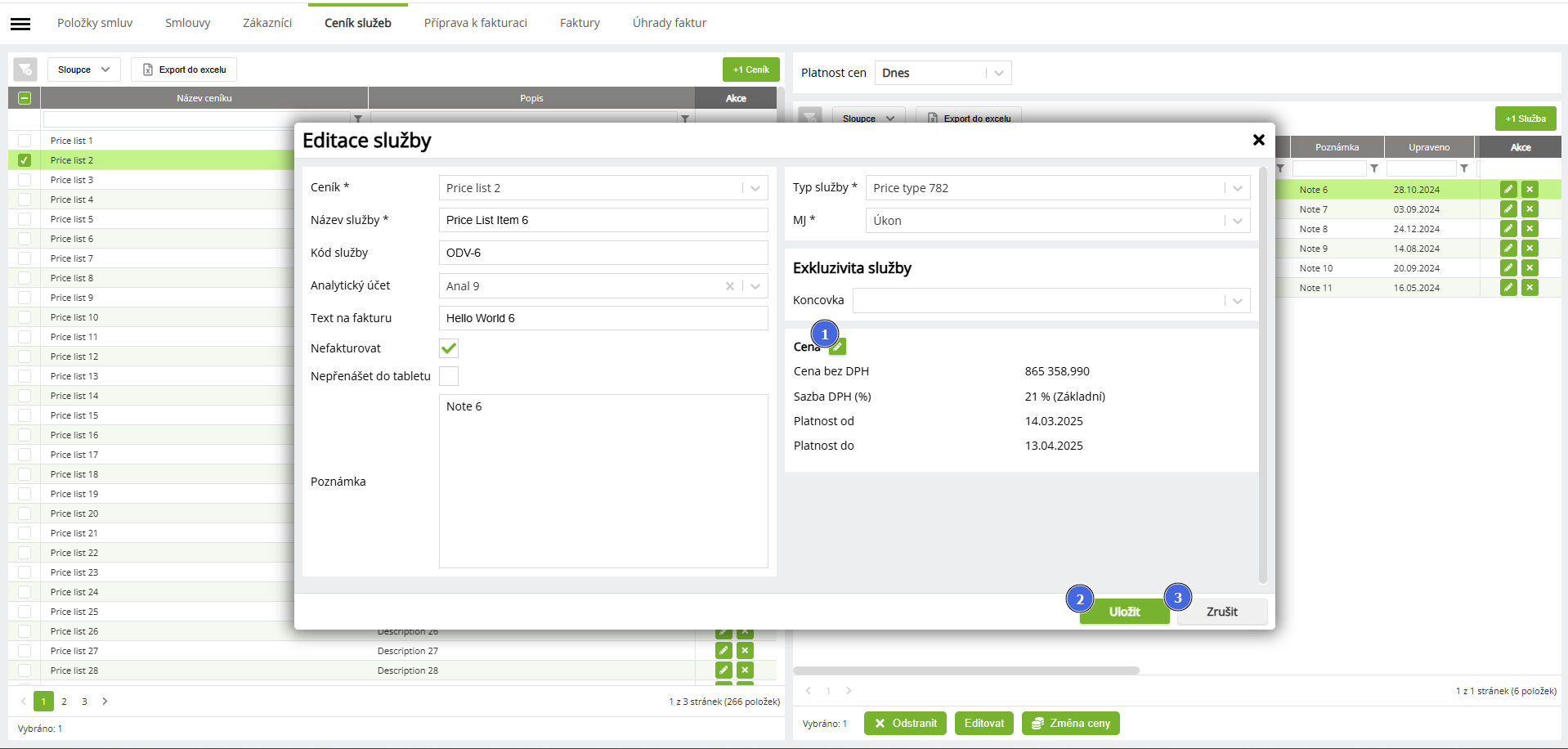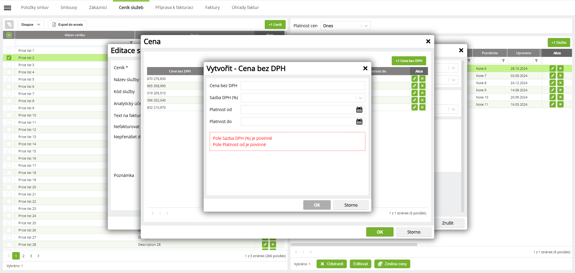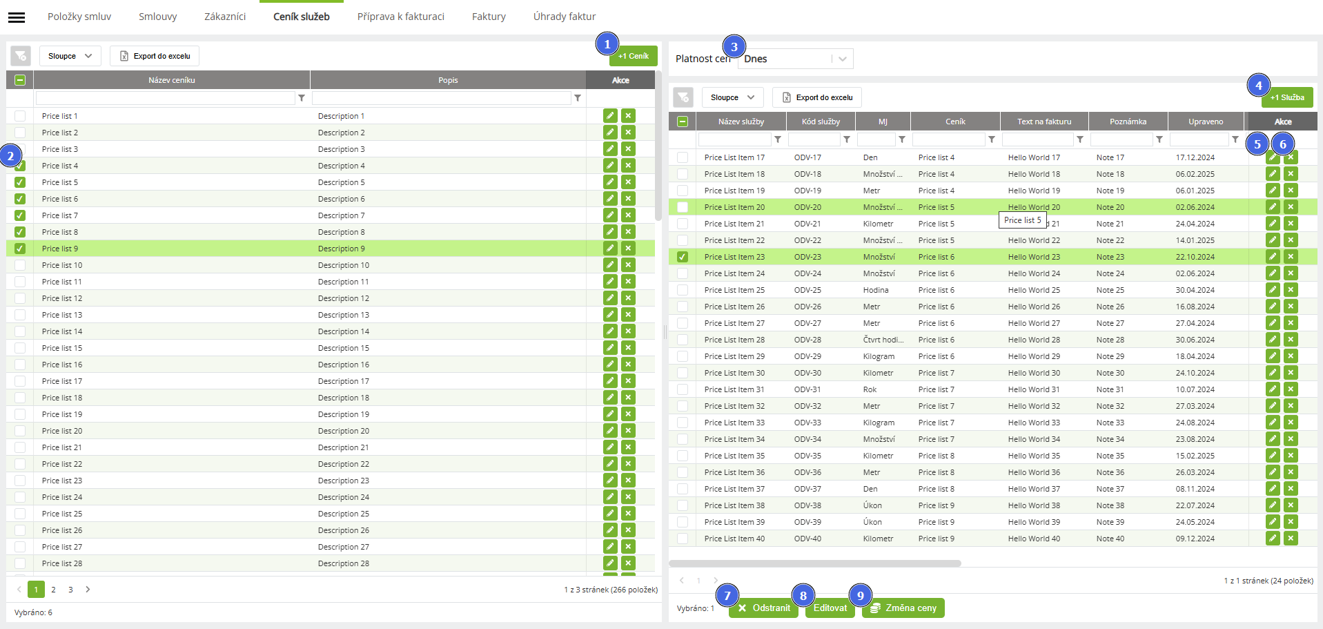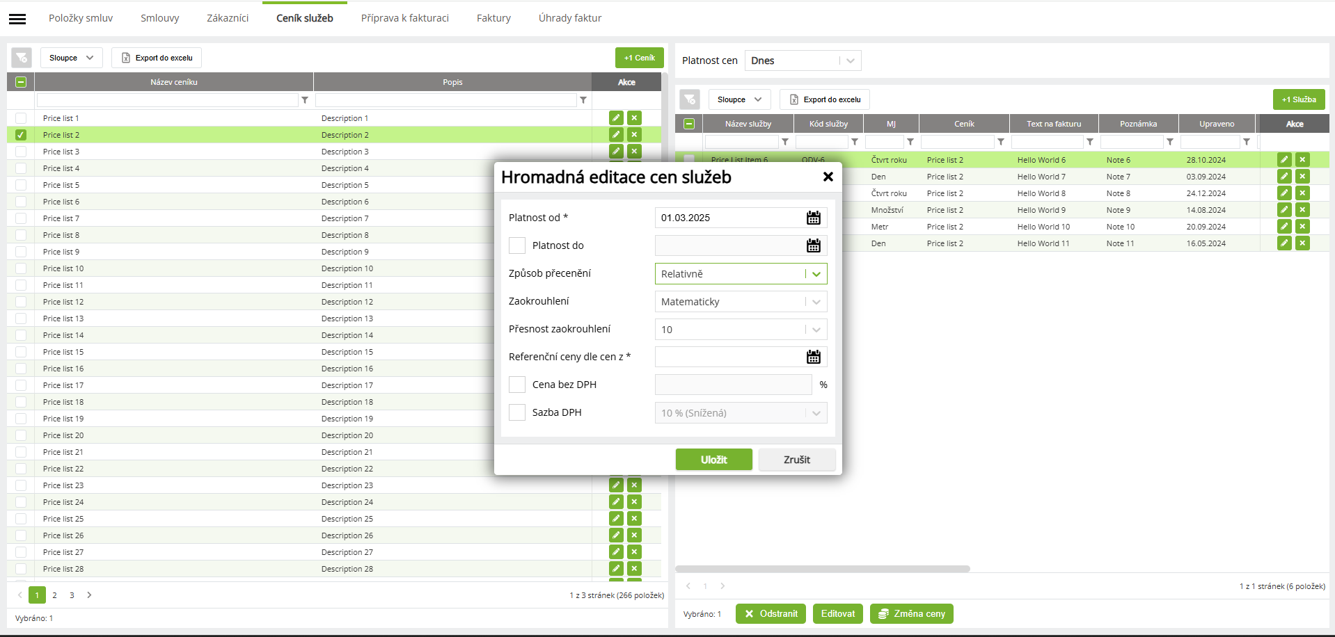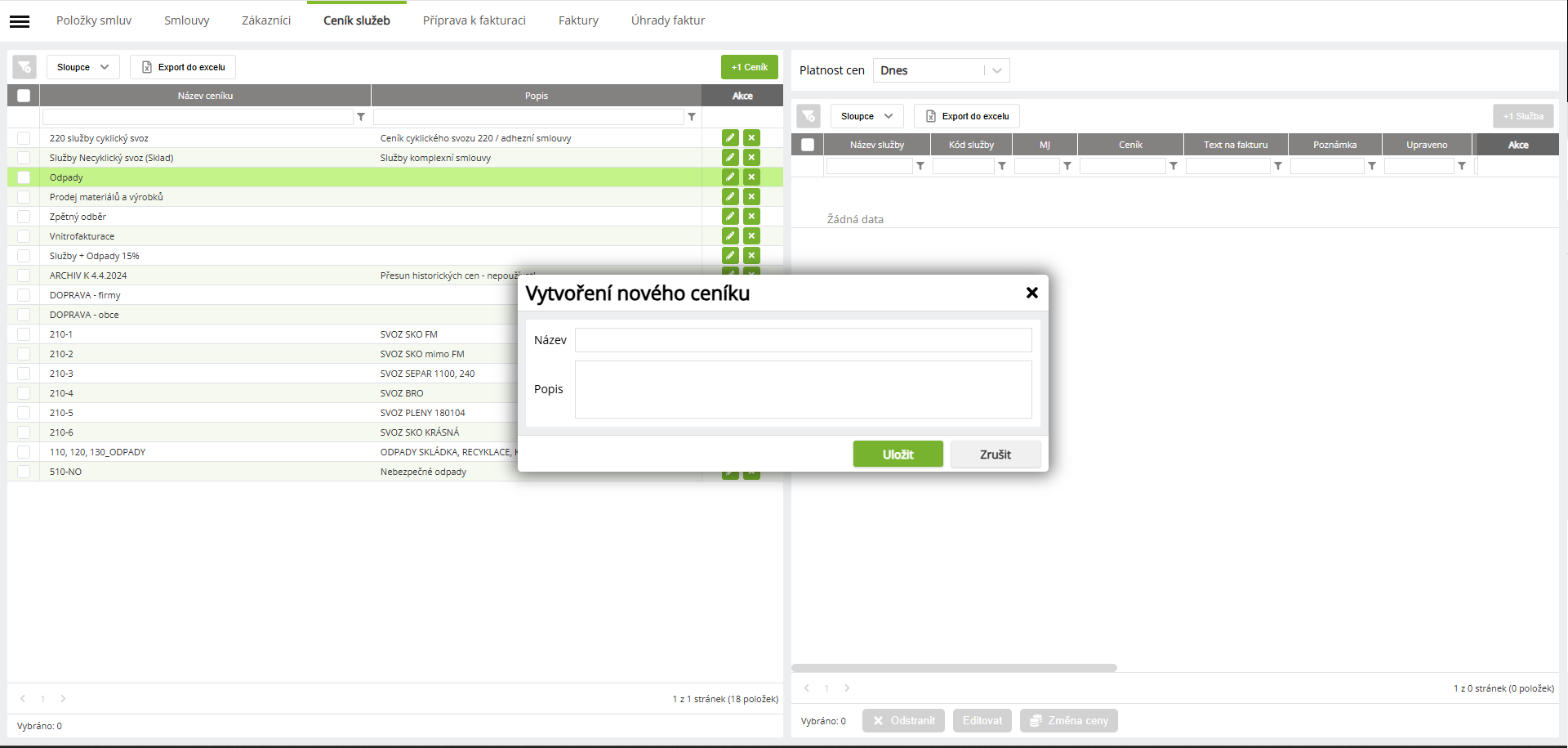 CeníkPřesun služby do některého z ceníků vybraných na levé straně obrazovky.