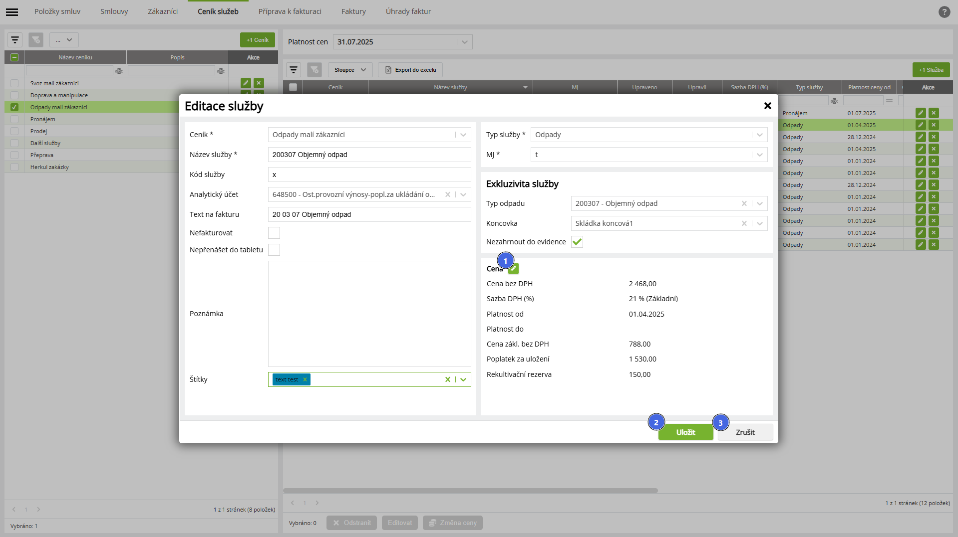 Poplatek za uloženíZobrazuje se pouze u Typu služeb Odpady. Jde o zákonem stanovené poplatky za uložení odpadu. Má specifický vliv na fakturaci.