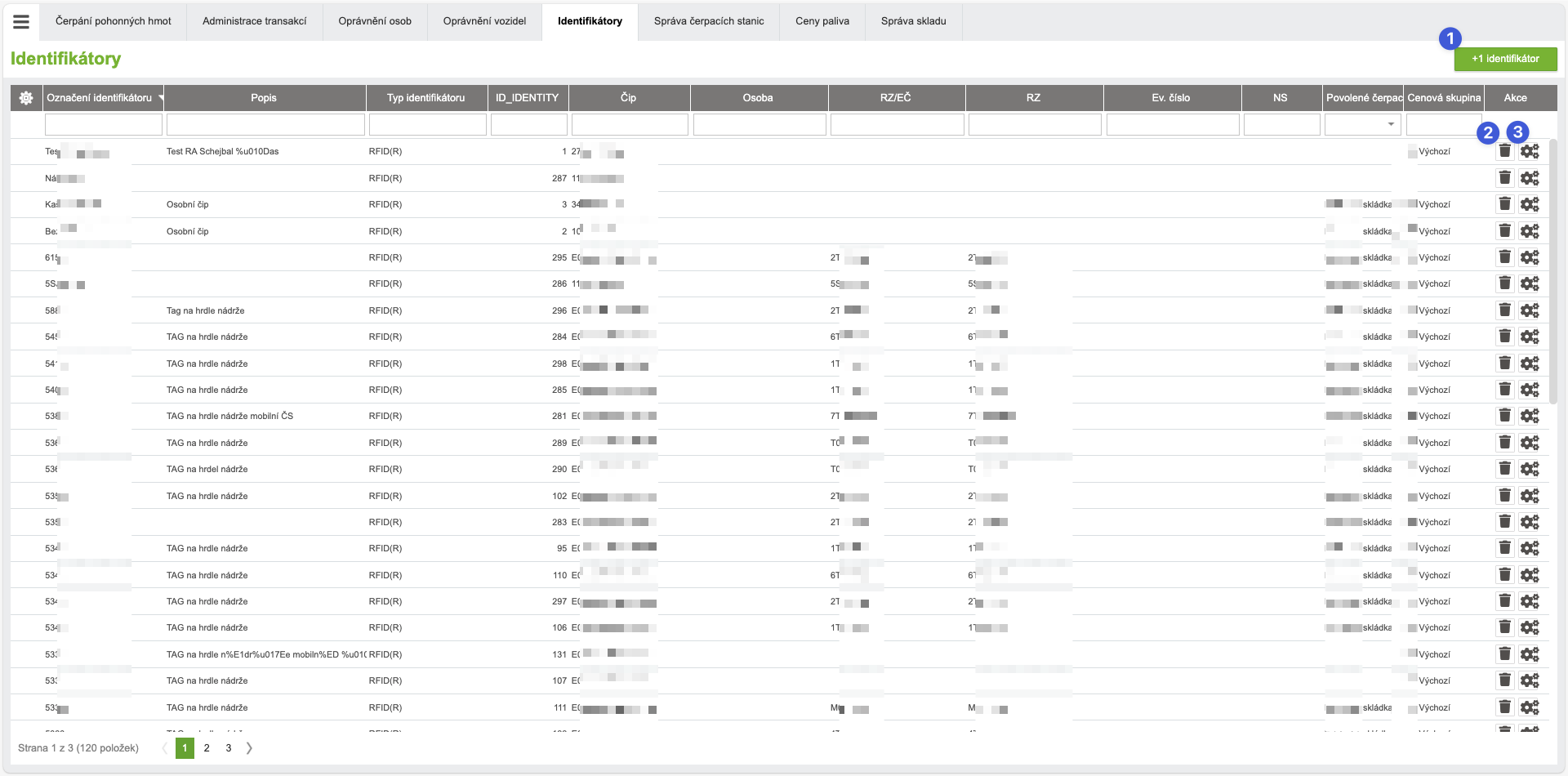 Obrazovka „Identifikátory“ umožňuje vytvářet nové identifikátory a přidělovat jim různá oprávnění pro čerpání pohonných hmot z čerpacích stanic.