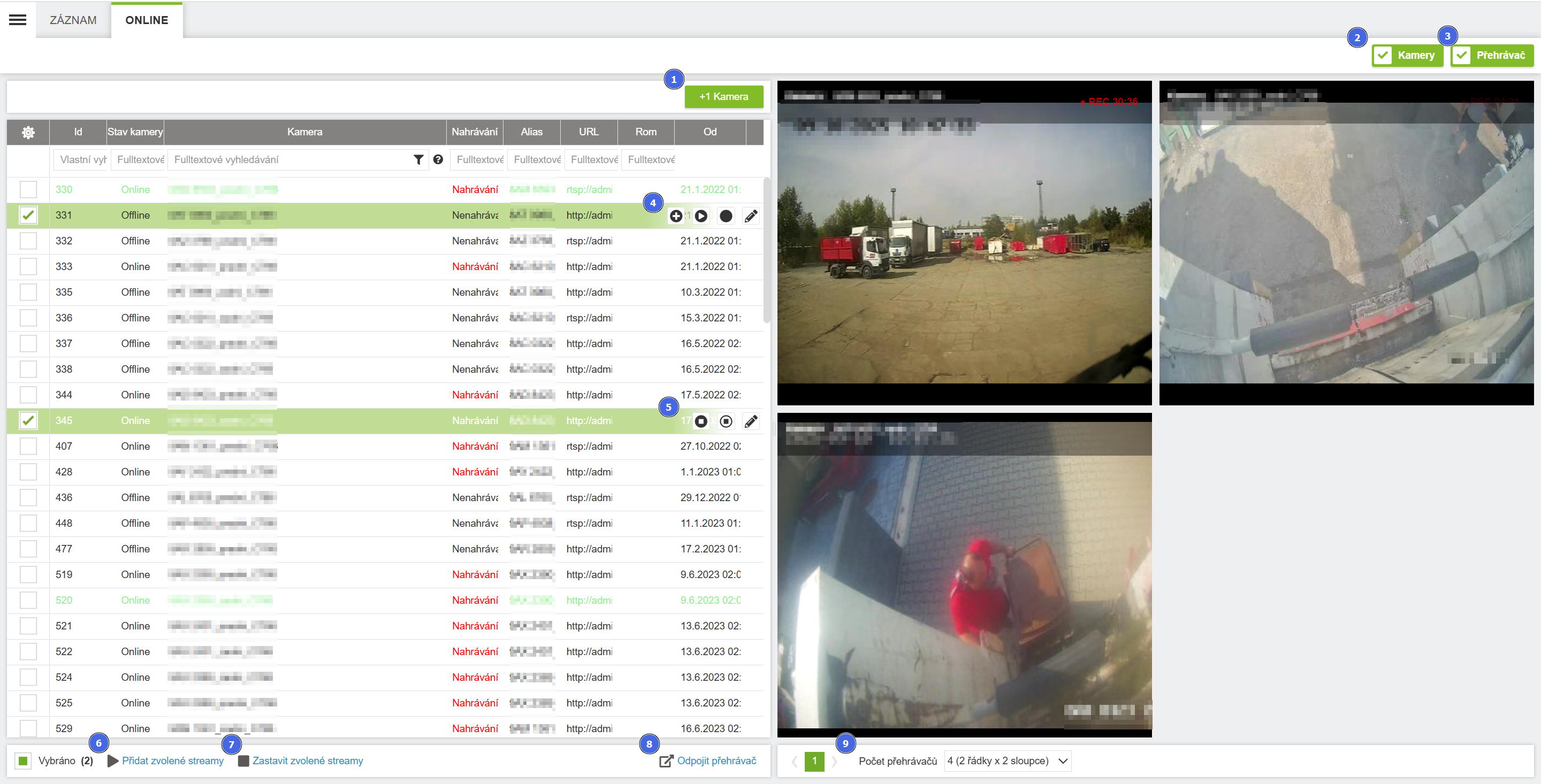 4Přidej stream, Spustit stream, Spustit nahrávání, UpravitPřidání další kamery do okna pro online přehrávání, Spuštění online přehrávání z kamery, Spuštění nahrávání pro vytvoření záznamu z kamery, které je potřeba také ukončit (viz funkce 5) pro zobrazení či stažení záznamu v záložce Záznam.  Upravení atributů dané kamery.
