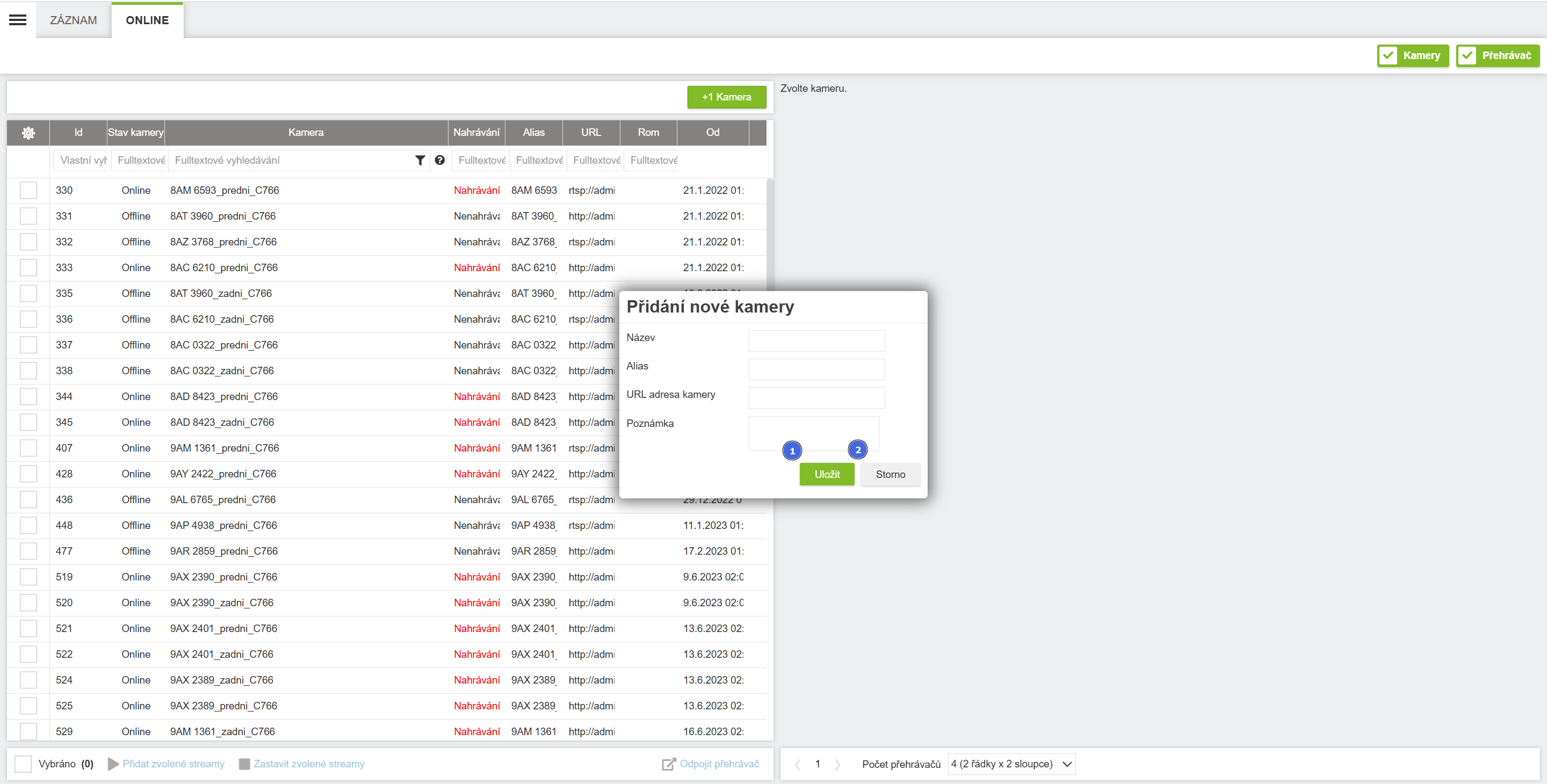 • Novou kameru lze přidat přes tlačítko +1 Kamera (viz funkce 1).