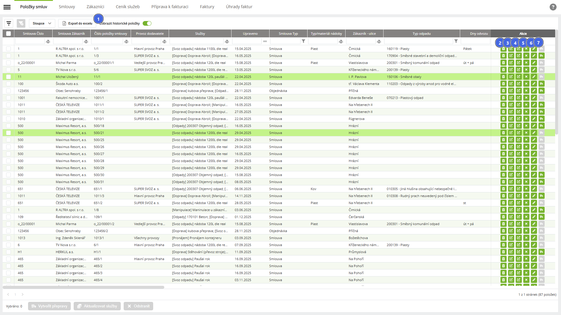 | 9 | Hromadné operace - Aktualizovat Služby | Funkce umožňuje aktualizaci služeb u položek smlouvy, a to na základě nových hodnot z Ceníku s platností od zvoleného data. Lze zvolit úroveň aktualizace i případné zachování historie vytvořením Následníka. Přecenění může ovlivnit i naplánované Zakázky nebo Přepravy. Detailní popis funkce je obsažen v záložce Smlouvy, kde lze také změny provést viz Nastavit ceny. |