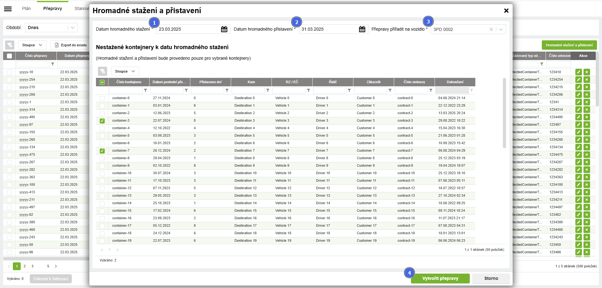 | 4 | Vytvořit přepravy | Po výběru kontejnerů z tabulky Nestažené kontejnery klikněte na tlačítko Vytvořit přepravy. Na základě zadaných údajů se vytvoří přepravní záznamy. |