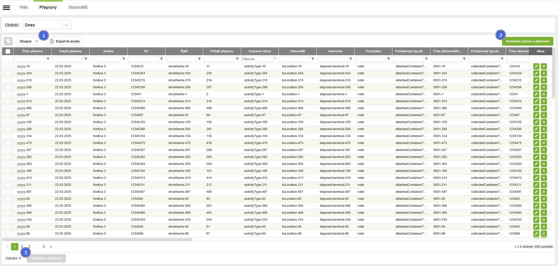 | 2 | Hromadné stažení a přistavení | Otevře nové okno pro hromadné operace s přepravami pronajatými přes konec měsíce, viz Hromadné stažení a přistavení. |