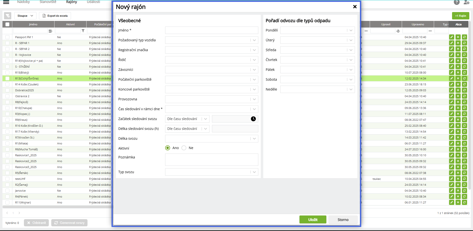 Záložka Rajóny slouží pro přehled a správu jednotlivých svozových rajonů. Svozový rajón definuje předpis pro vozidlo a jeho posádku, lze ho definovat počátečním a konečným parkovištěm, svozovým vozidlem atd.