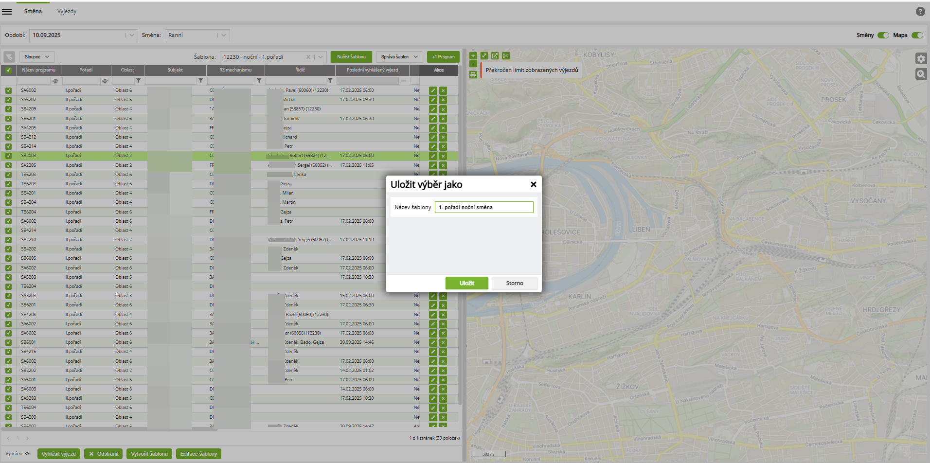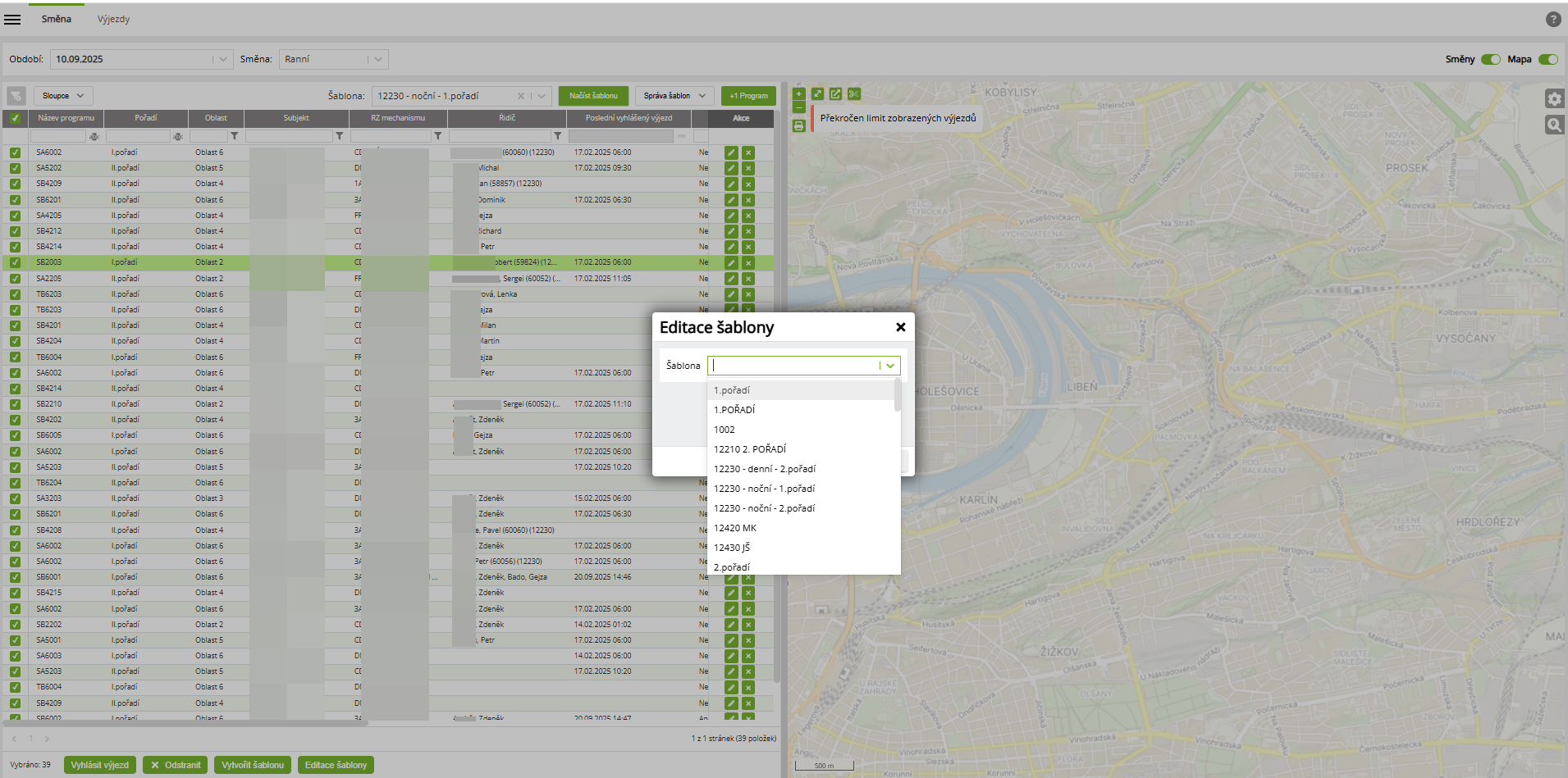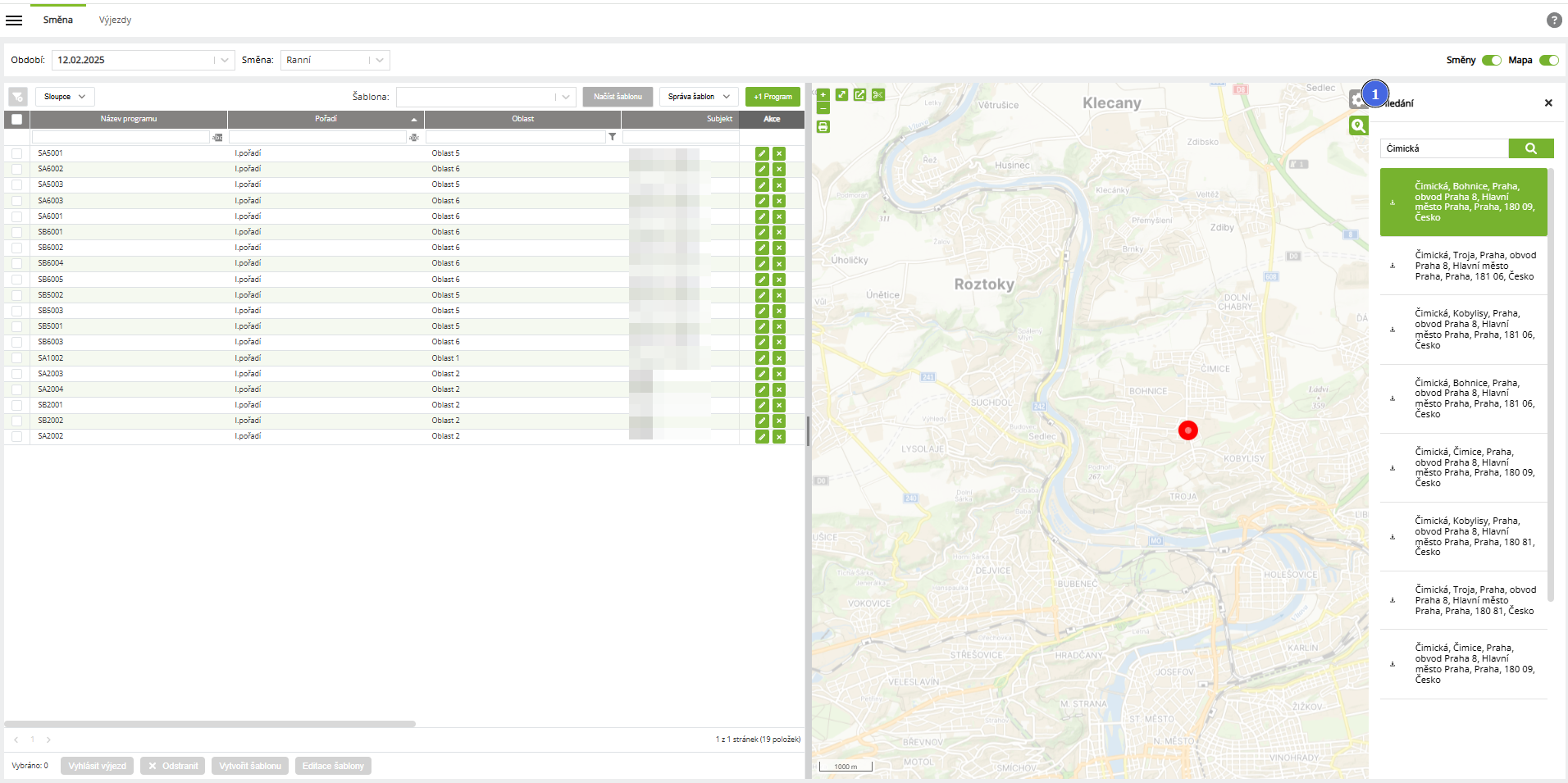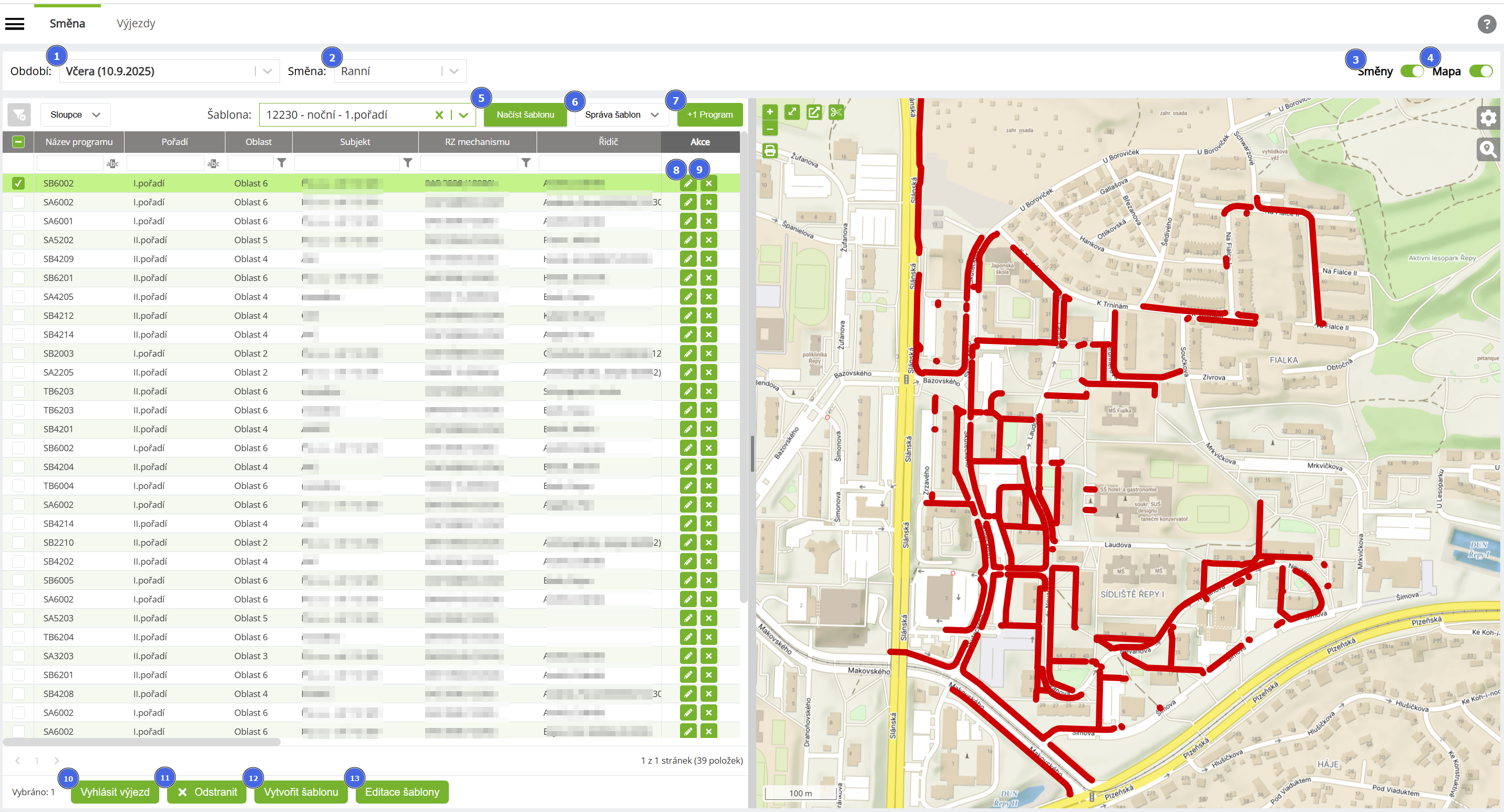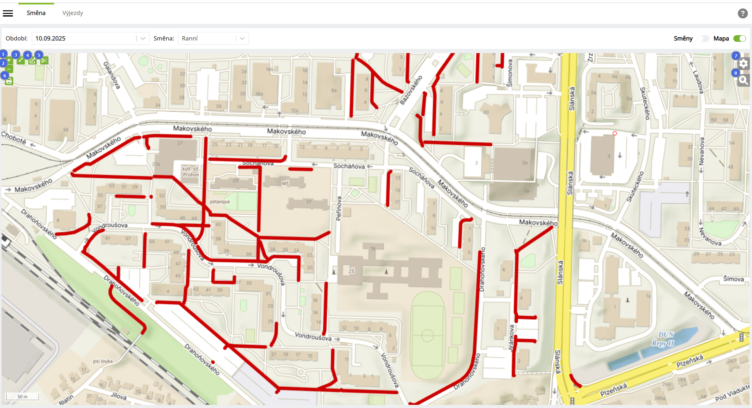 Na záložce Směna probíhá příprava programů na výjezd. Programy lze připravit na každou směnu zvlášť, a to i do budoucnosti. Práci při plánování usnadňují šablony, které si mohou dispečeři připravit individuálně nebo si je mezi sebou sdílet. V mapě se zobrazuje předpis programu - uliční úseky, které mají být obslouženy ve výjezdu.