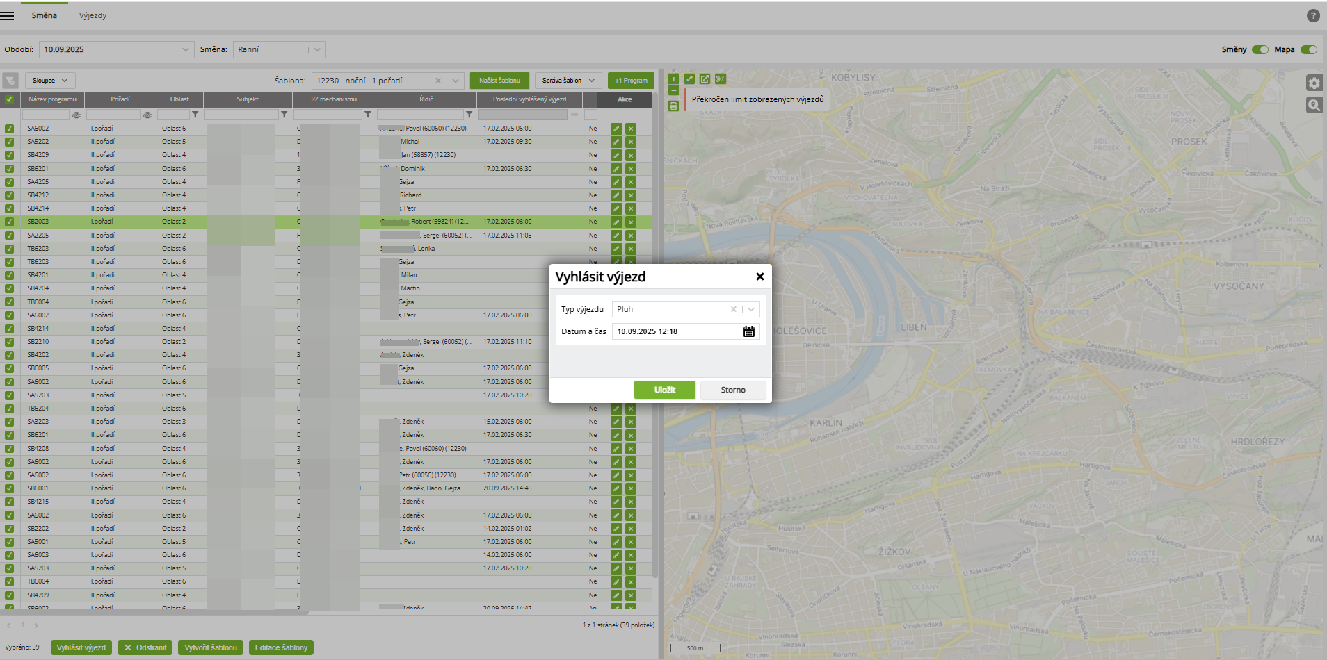 | 10 | Vyhlásit výjezd | Tlačítko hromadných operací zobrazí okno pro vyhlášení výjezdu. Detail Vyhlásit výjezd. |