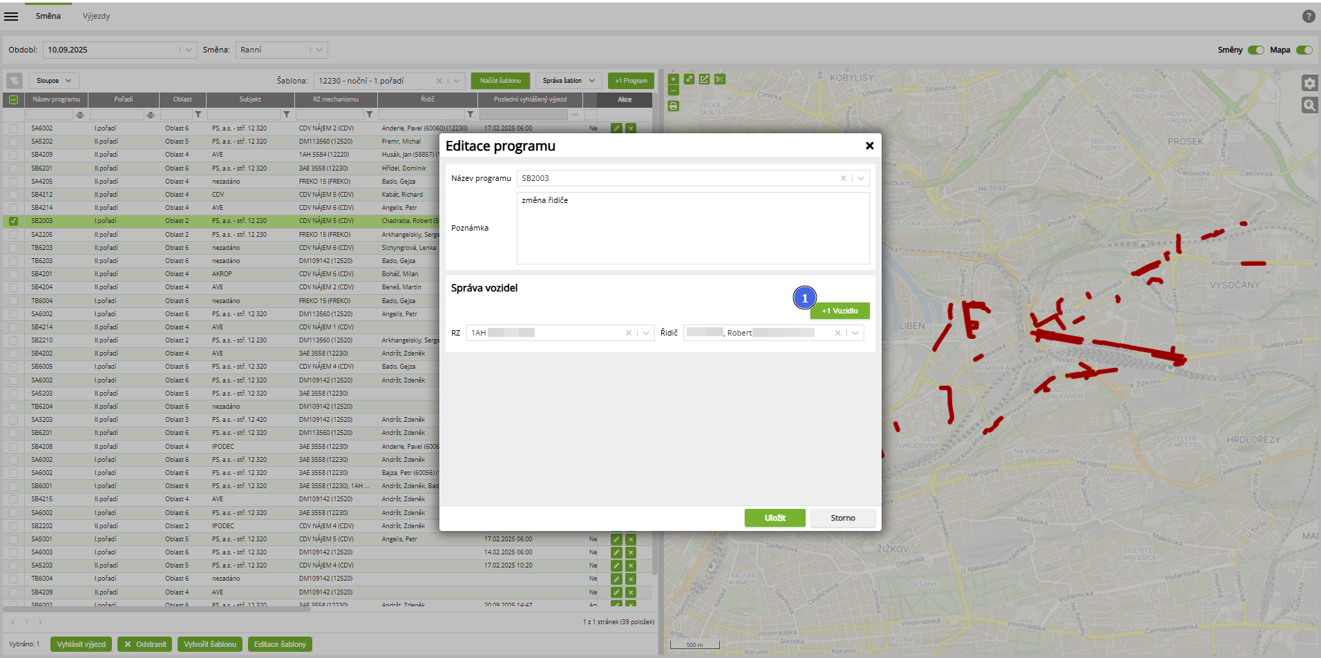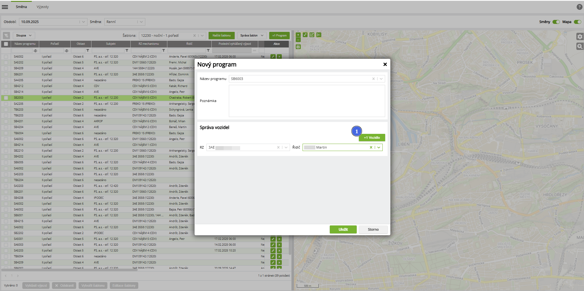 | 1 | +1 Vozidlo | Přidá další řádek pro přiřazení dalšího vozidla na program. Lze vybrat i řidiče. Křížkem vpravo u řádku se řádek s vozidlem zase odebere. Povinné je jedno vozidlo. |