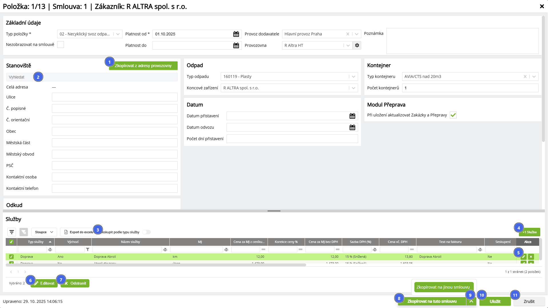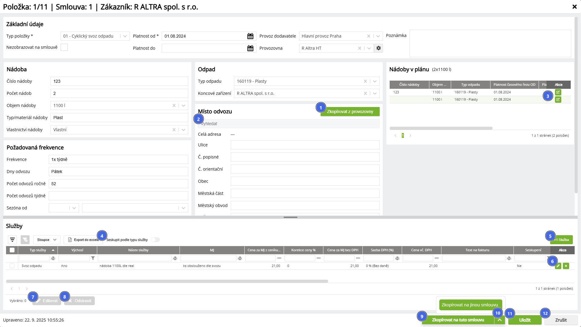 | 9 | Zkopírovat na tuto smlouvu | Vytvoří kopii stejné položky na této smlouvě, jako je právě otevřená položka. Vytvořením nové kopie je možné zvolit, zda má vzniknout kopie jako následník. Při výběru této možnosti dojde k úpravě vazeb existujících Zakázek, Přeprav nebo Nádob z původní položky smlouvy na tuto nově zakládanou. Vytvořením kopie (vč. volby následníka i bez ní) zůstává původní položka stále v platnosti, uživatelsky je možné ji ukončit (nastavit datum Platnost do). |