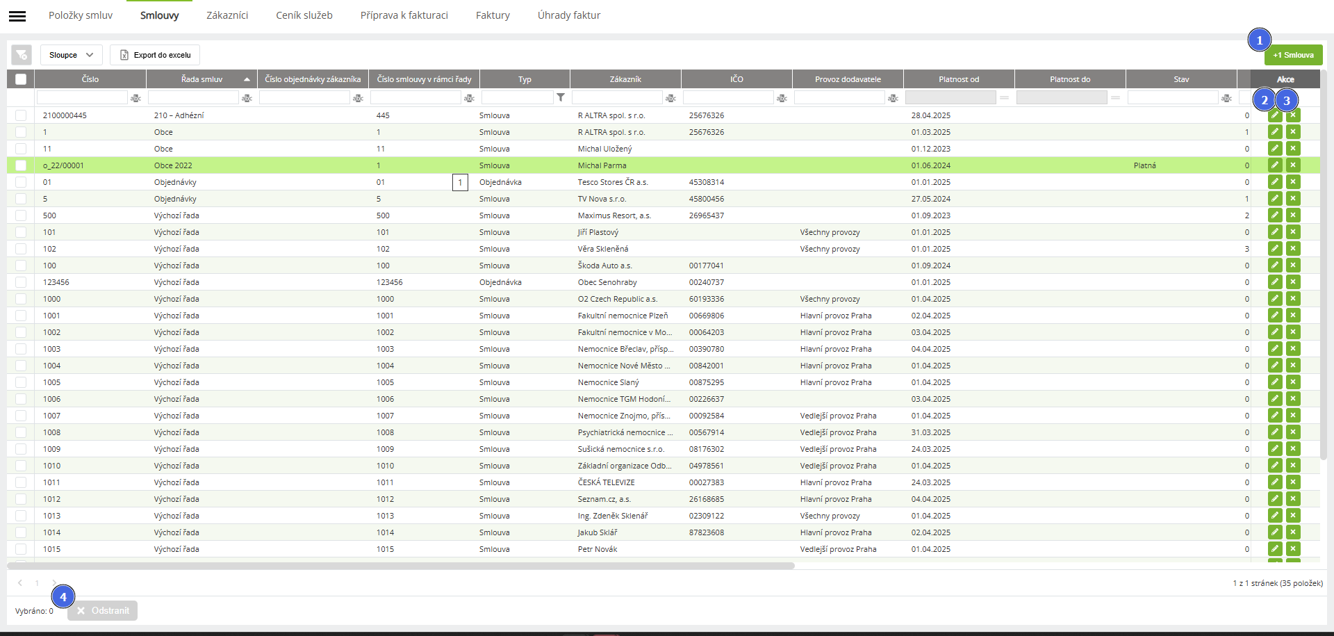 | 4 | Hromadné operace - Odstranění | Odstranění smluv, které jsou označeny. |
