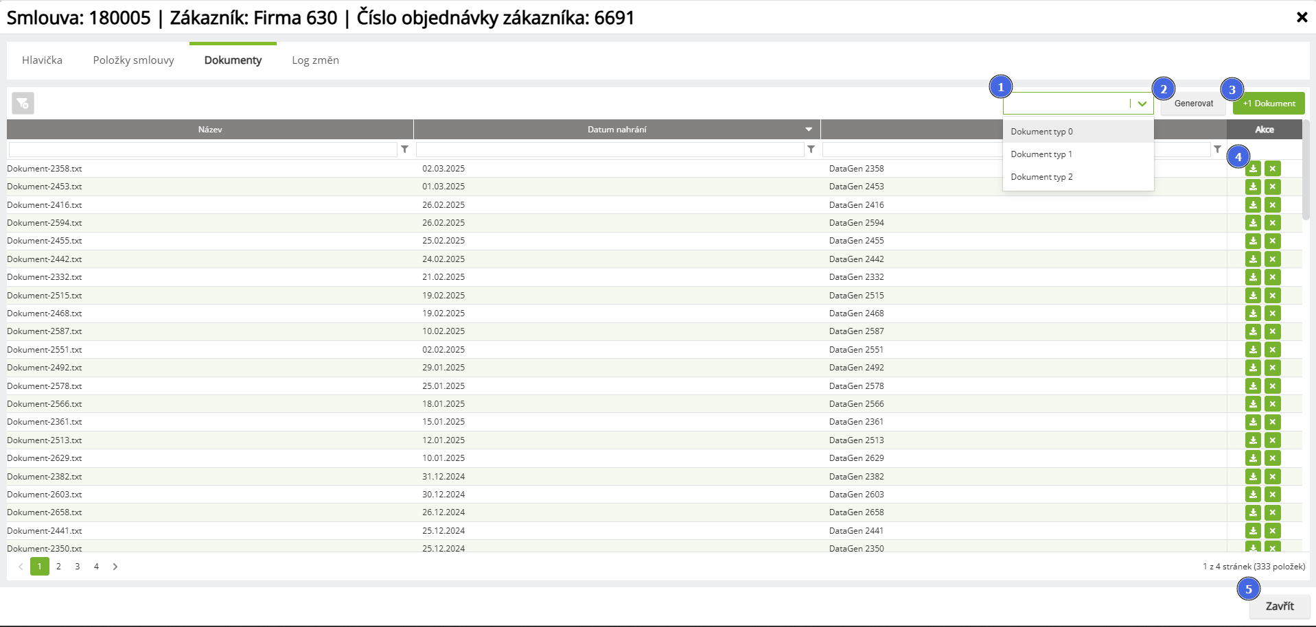 | 1 | Rozbalovací seznam | Zvolí se typ dokumentu pro vygenerování. V systému mohou být připraveny šablony pro vygenerování např. smluv, dodatků, objednávek, prohlášení. Výchozí nastavení obsahuje základní dokumenty pro přidání další je nutné kontaktovat Projektového manažera. Dokumenty jsou obvykle dostupné ve formátu *.doc (Microsoft Word). |
