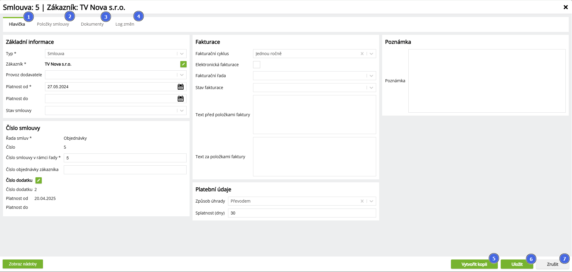 | 5 | Vytvořit kopii | Vytvoří se kopie aktuální smlouvy, kdy je poté možné Uložit kopii nebo ji Zrušit vytváření kopie. Vždy je třeba u kopie změnit minimálně číslo smlouvy, protože nemohou existovat smlouvy se stejným číslem (uživatel je při ukládání na toto upozorněn). Na rozdíl od editace stávající smlouvy lze u kopie smlouvy provést i změnu zákazníka. |