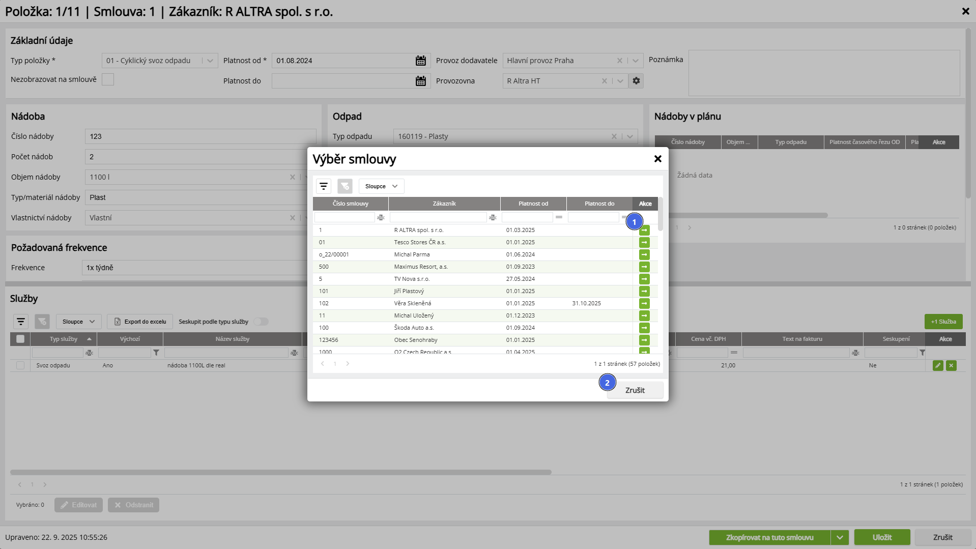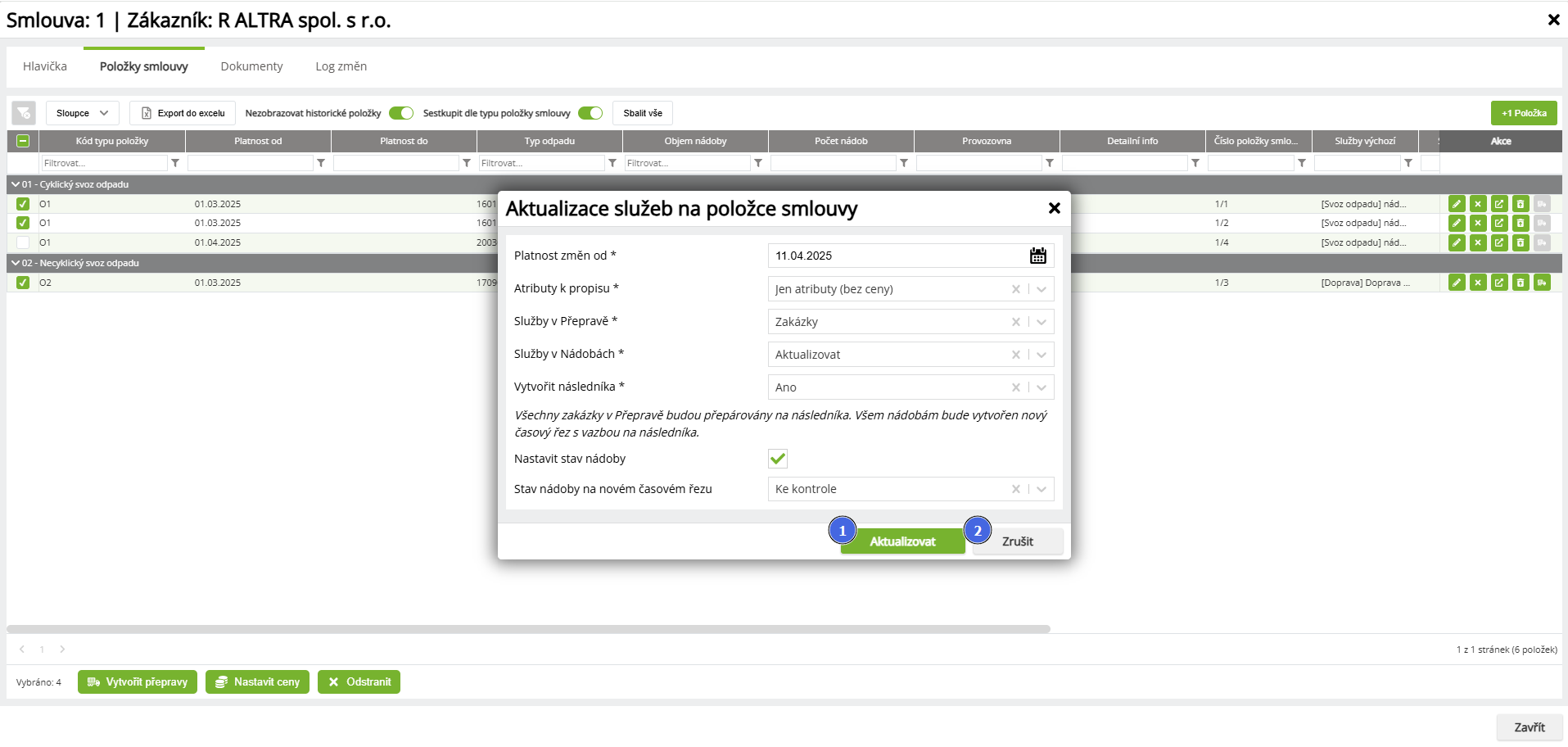 | Vytvořit následovníka | Vytvoření následníka danou položku smlouvy ukončí (nastaví jí datum do odpovídající zvolenému datu v dialogu) a založí novou položku smlouvy se stejnýmí parametry, ale daty aktualizovanými z ceníku. Na pozadí se pak provede operace, která upraví vazby dané položky smlouvy. V modulu Přeprava se do Zakázek a Přeprav nastaví vazba na novou Položku smlouvy (s cenou a dalšími parametry) a v nádobách se vytvoří nový časový řez, který bude obsahovat nové služby. V obou případech se na zakázkách nastaví výchozí služby z dané položky smlouvy. |