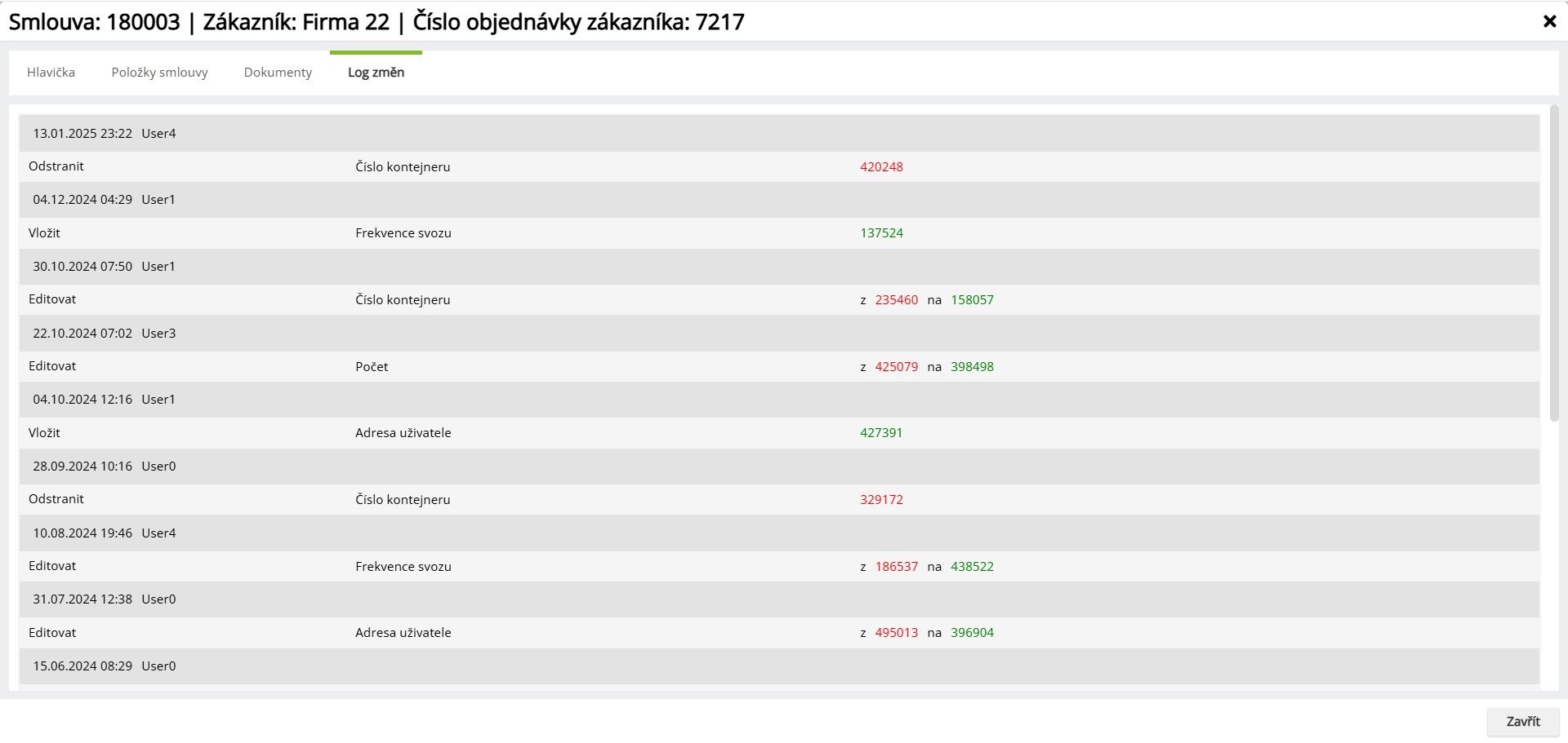 - Záložka evidují změny prováděné na smlouvě nebo položkách smlouvy.