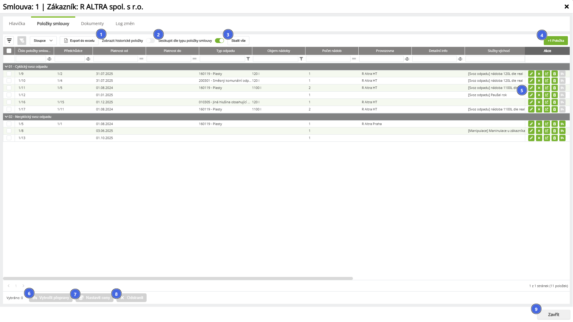 Obsahuje jednotlivé položky, které jsou obsaženy na smlouvě. Položky jsou seskupeny dle Typu (Cyklické, Necyklické, popř. Příjem odpadu na koncové zařízení).