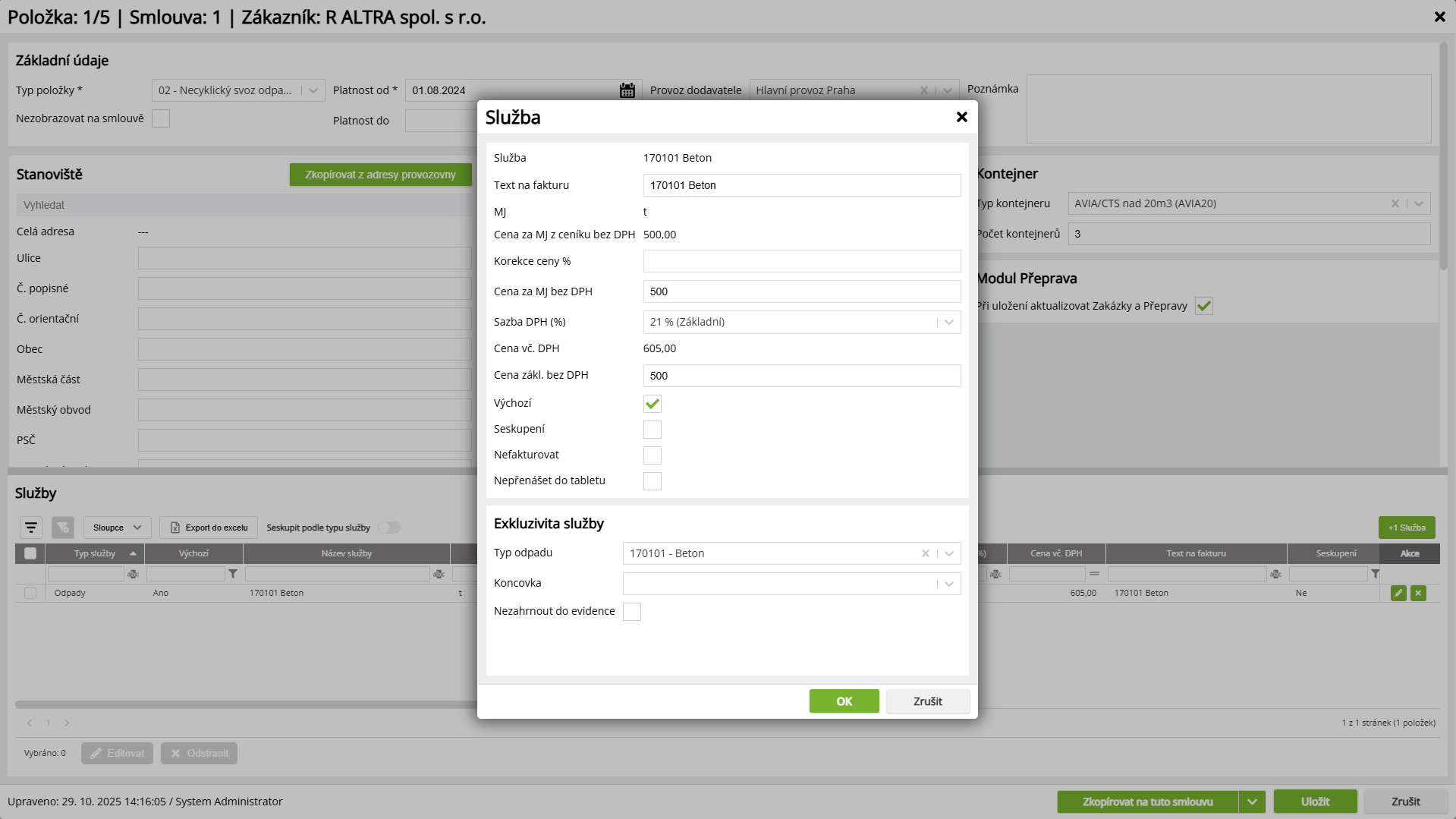 | Služby v Přepravě | Pro položky Necyklického svozu je možné, kde změny v modulu Přeprava aktualizovat: