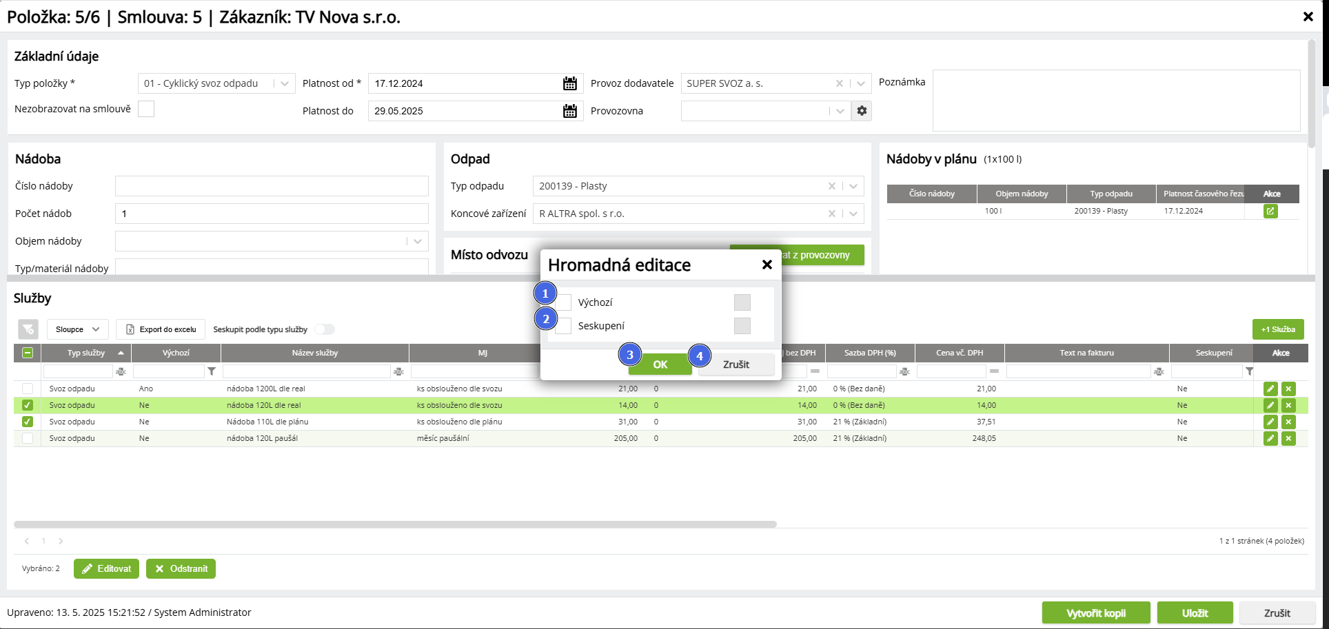 Upravit (Hromadné operace) - Služby na položce smlouvy