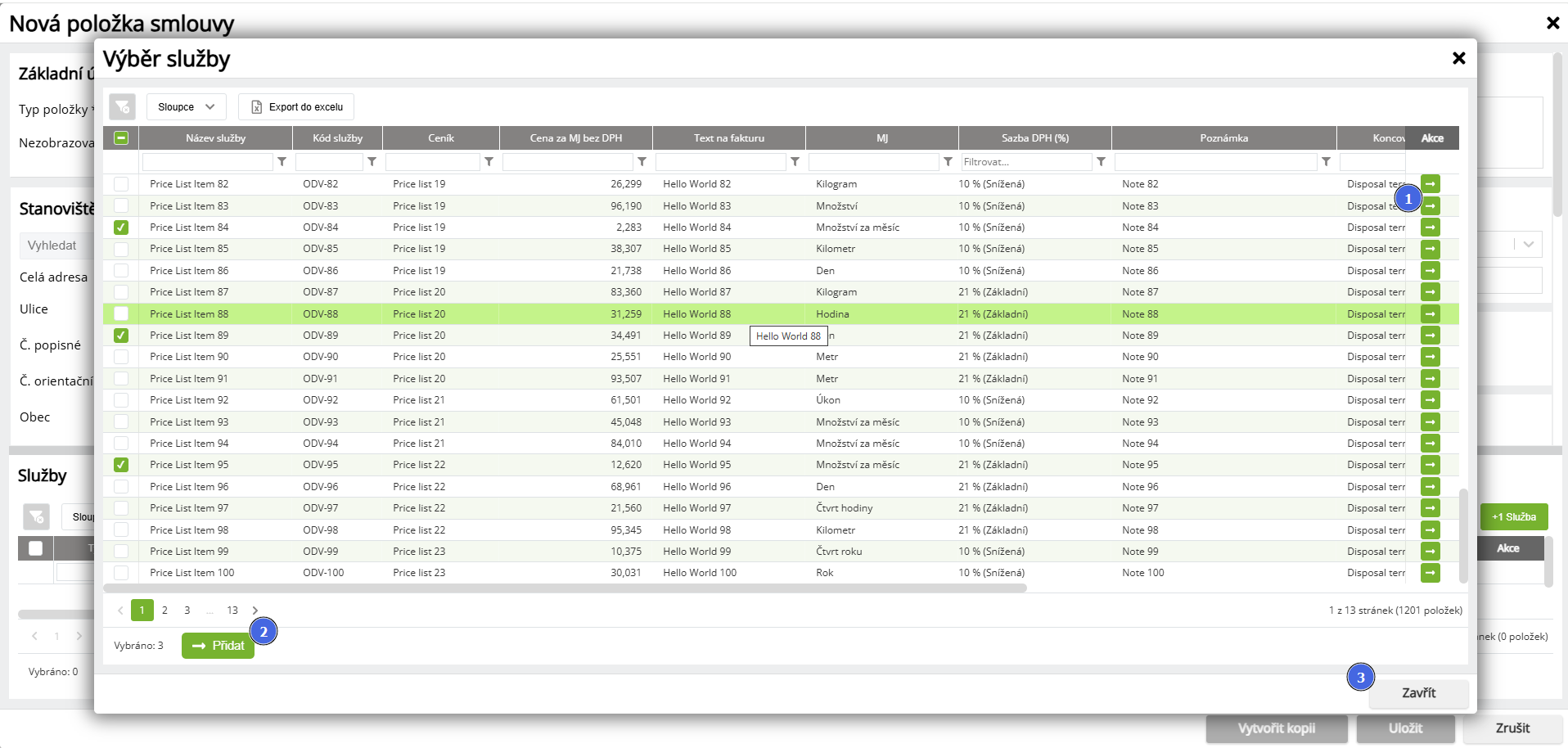 | 2 | Přidání označených služeb | Přidá všechny vybrané služby na Položku smlouvy a zavře okno pro Výběr služeb. |