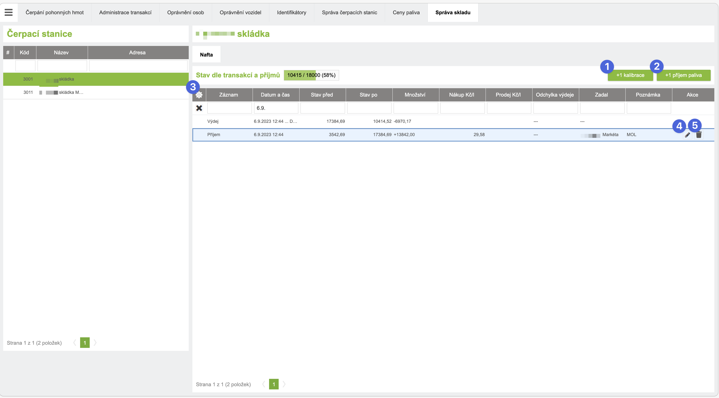 Obrazovka „Správa skladu“ umožňuje zaznamenávat příjmy pohonných hmot a spravovat stav nádrží čerpacích stanic.