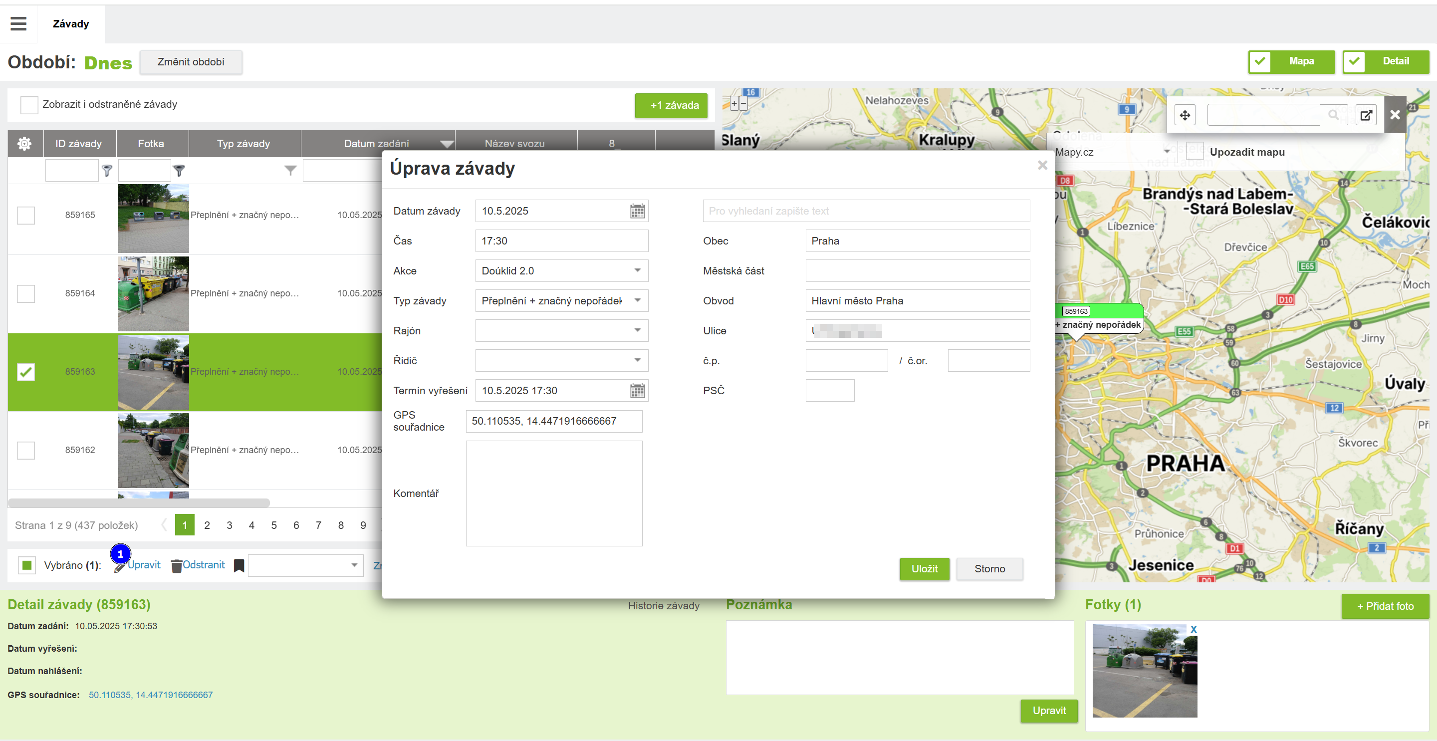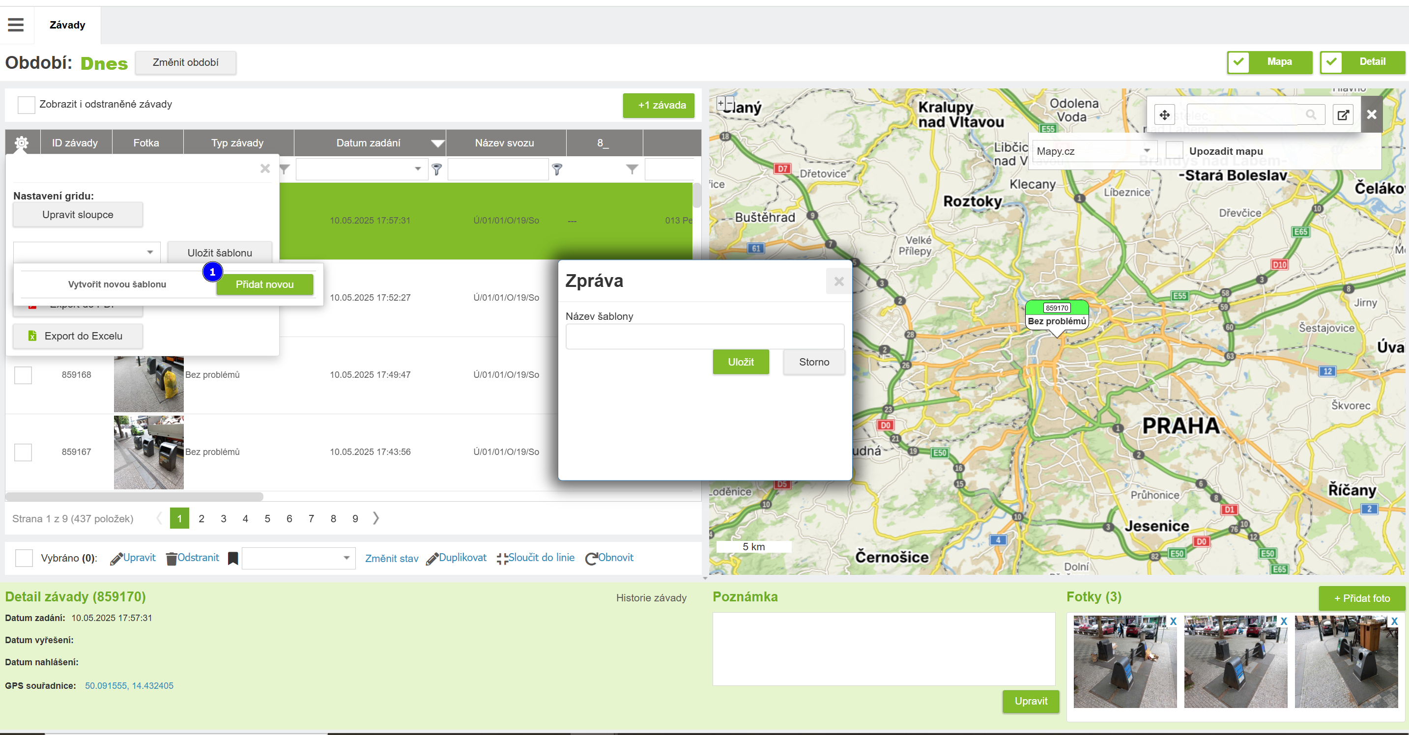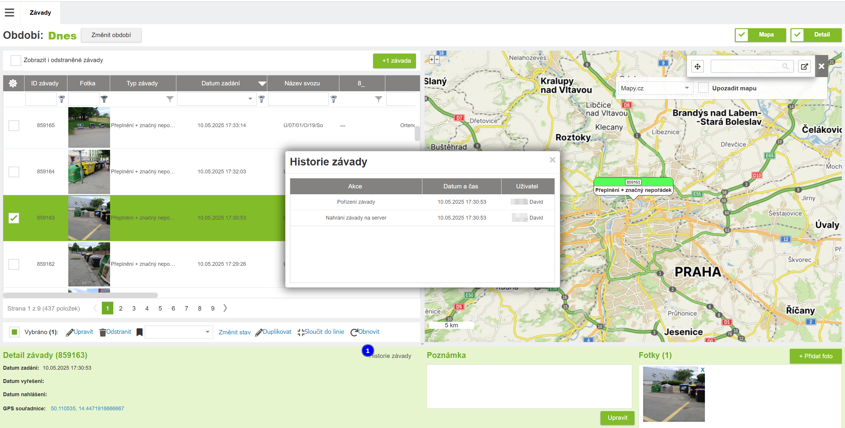 Závadu je možné přidat manuálně i tady bez nutnosti zadat ji v mobilní aplikaci. Po kliknutí na tlačítko se otevře dialogové okno pro zadání parametrů závady. Po jejím uložení je možné přidat jednu nebo víc fotografií v detailu závady. Dále se se závadou pracuje stejně jako se závadou z mobilní aplikace.