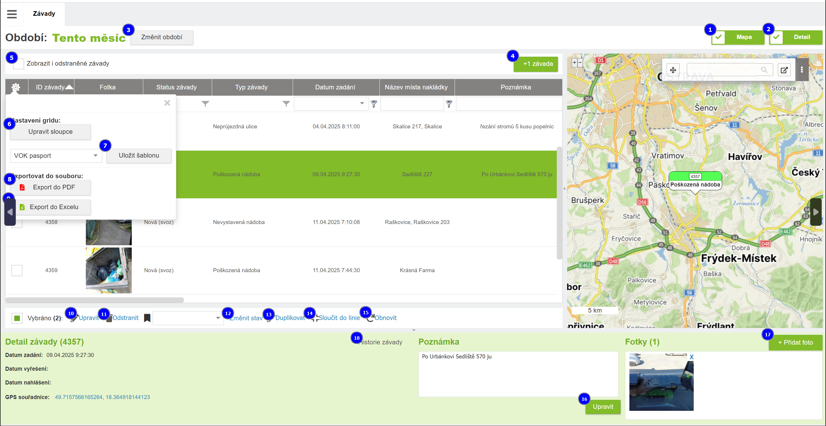 | 3 | Změnit období | Výběr datumu nebo období, pro které se vypíší závady. Defaultně je nastaveno Dnes. Další možnosti jsou Včera, Tento měsíc, Minulý měsíc, Tento rok, Minulý rok, Vše a Vyberte interval. Při větším množství závad s fotografiemi doporučujeme nevolit pro výpis závad příliš dlouhá období. |