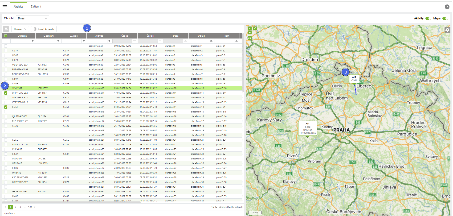 1. Ve sloupci aktivity (1) je přehled všech aktivit zařízení. Po označení požadovaného zařízení v prvním sloupci (2) se zobrazí jeho poloha v mapě (3). V případě aktivity typu jízda se zobrazí i její trajektorie.