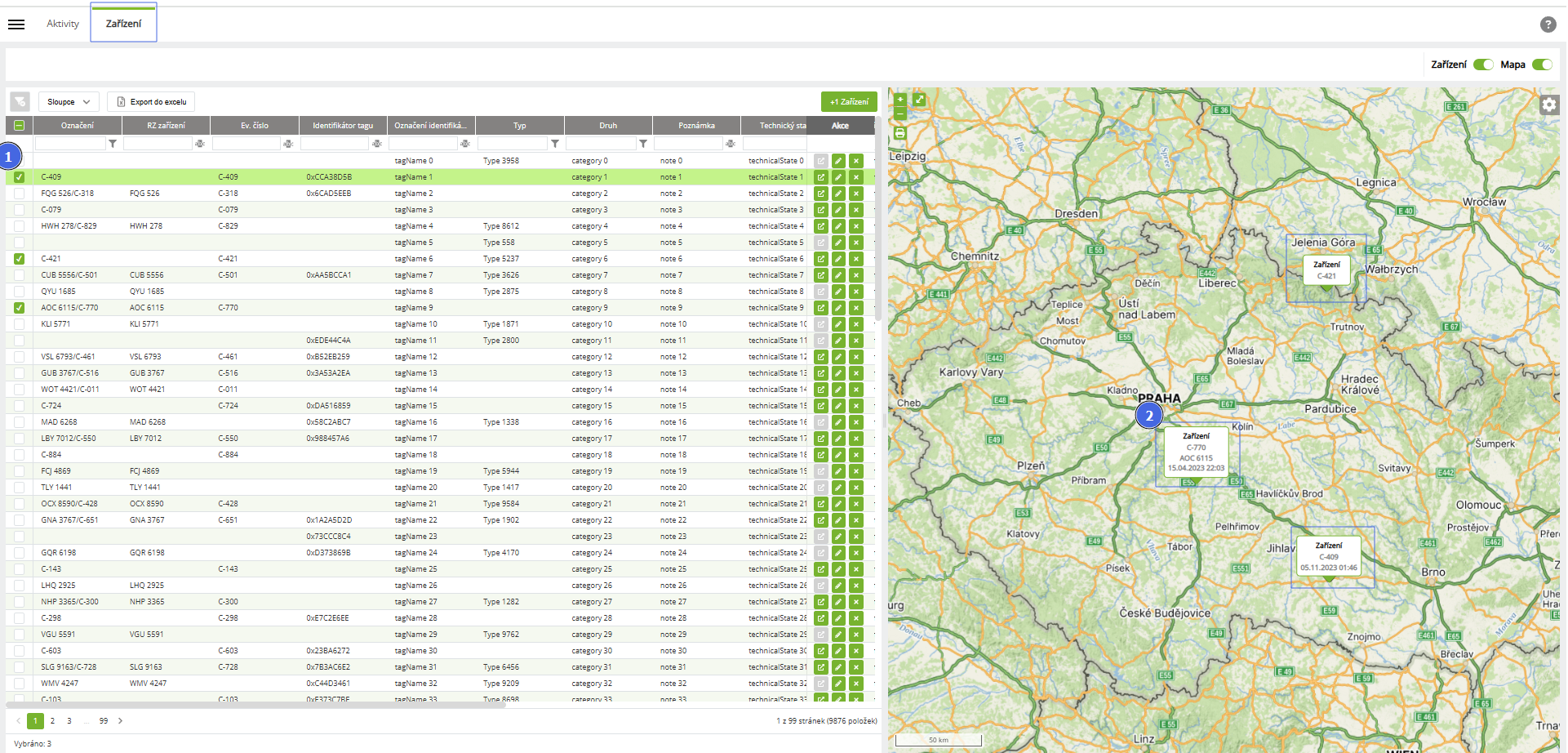 1. Označením požadovaných zařízení v prvním sloupci (1) se vybraná zařízení zobrazí v mapě (2)